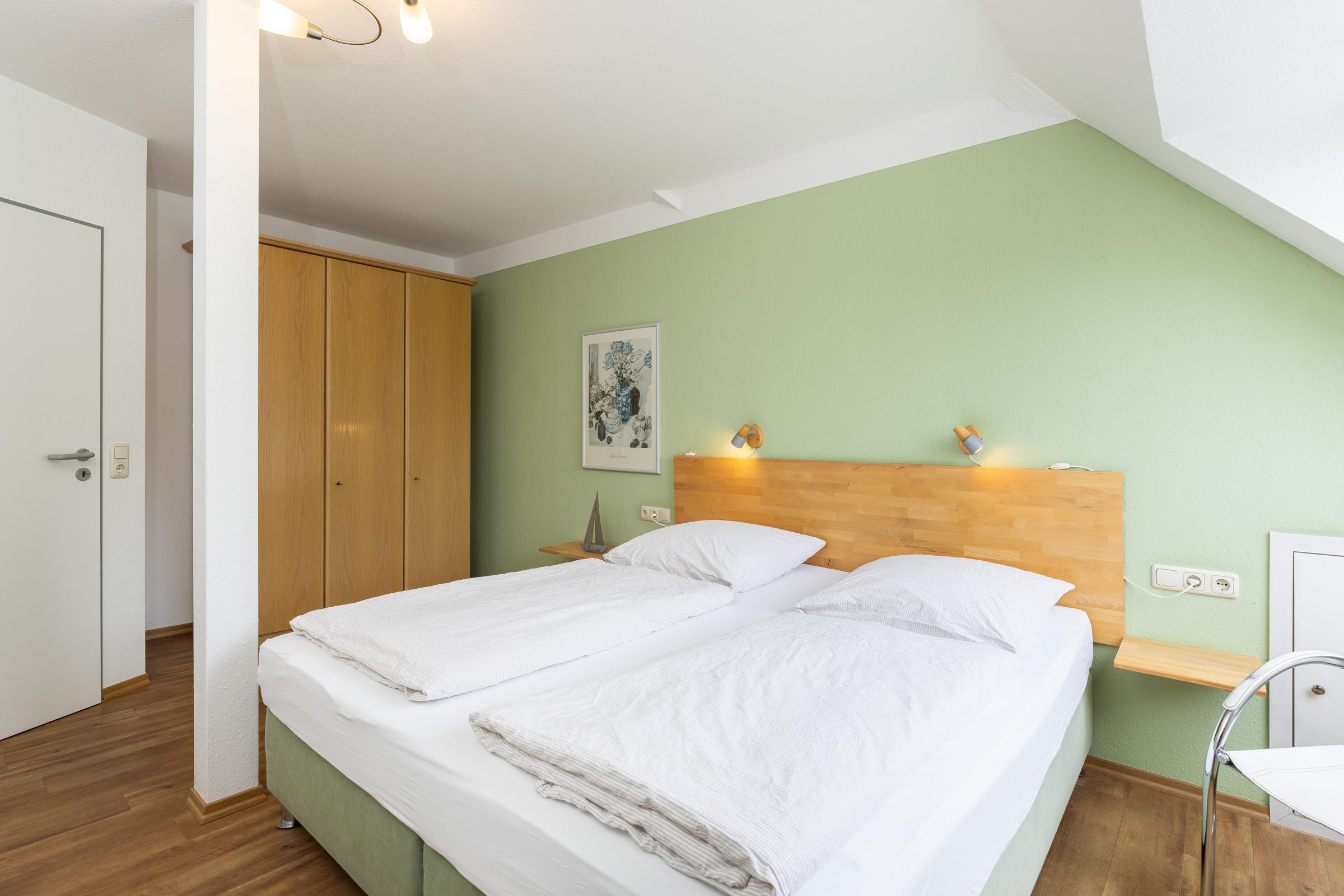 Das Elternschlafzimmer ist mit einem Boxspringbett (je 90 x 200 cm) und 4-türigem Kleiderschrank eingerichtet.