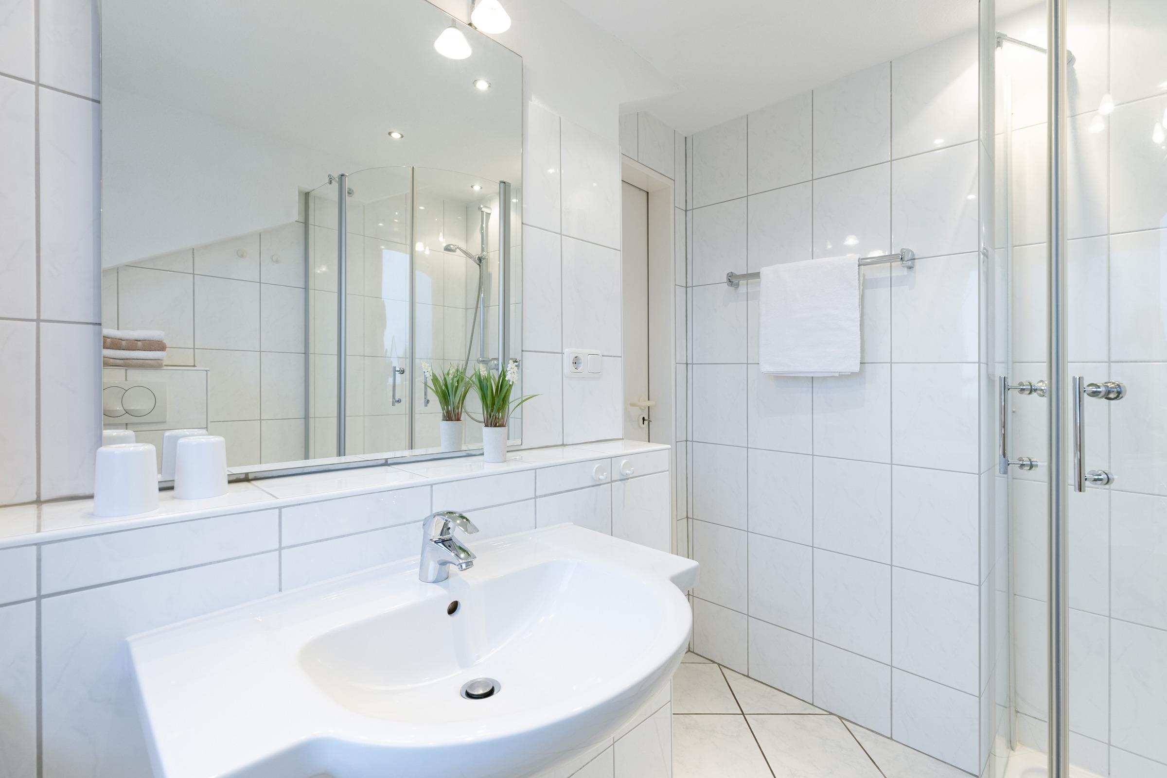 Das Badezimmer mit Glasduschwand und Qualitätsarmaturen wirkt großzügig, auch durch viel Fensterfläche.