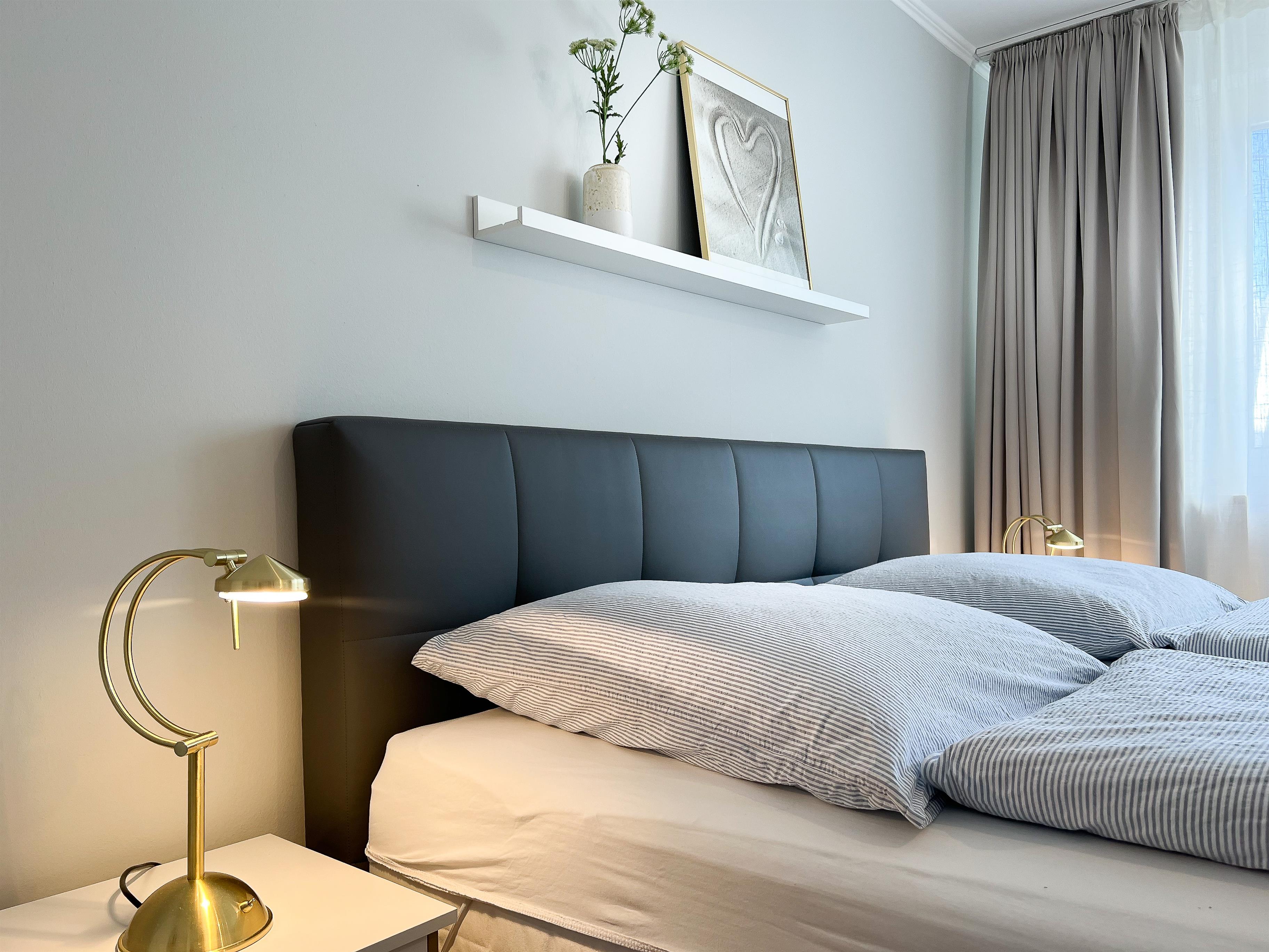Das 2. Schlafzimmer ist eingerichtet mit einem Boxspringbett und einem Wandklappbett (je 90 x 200 cm).
