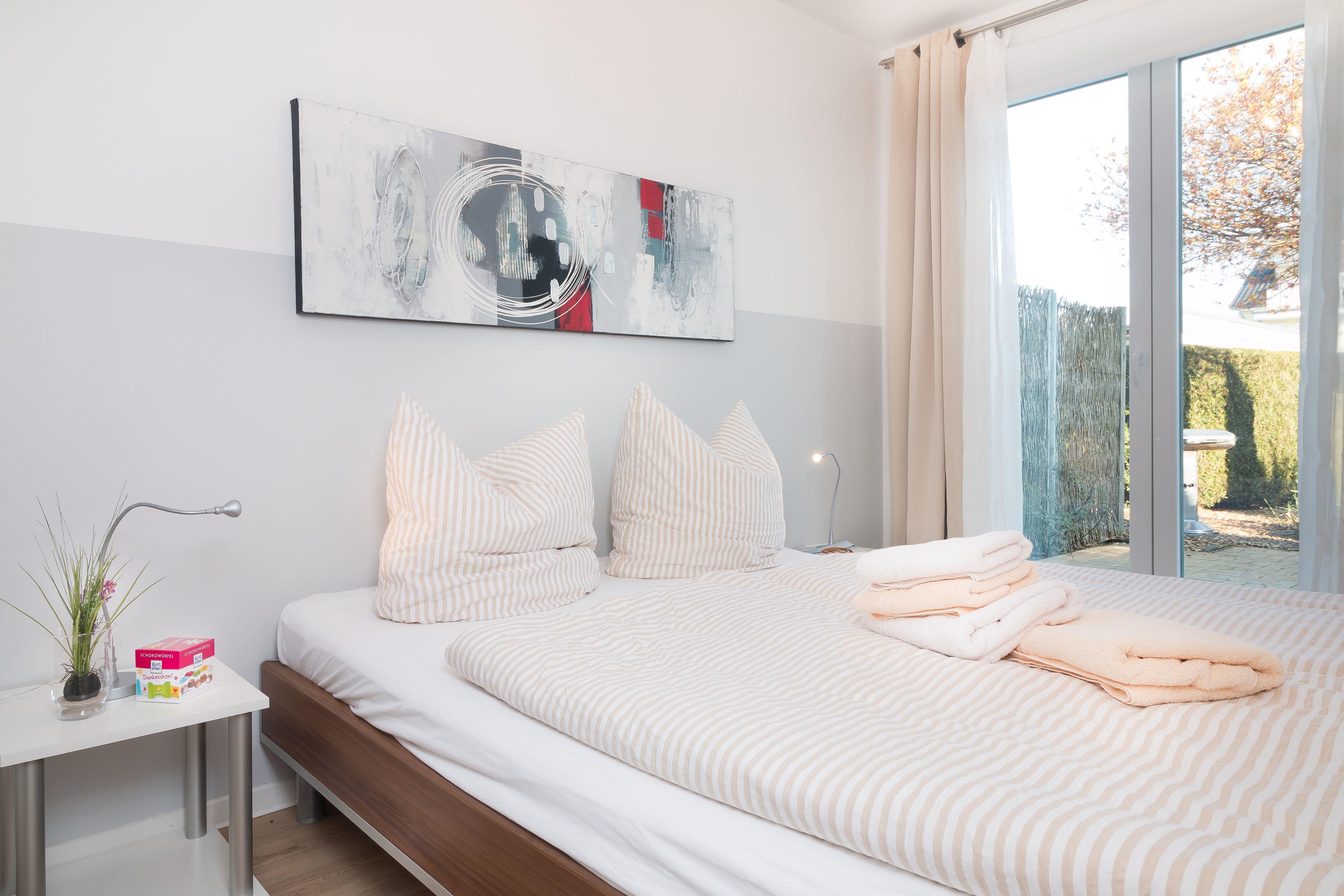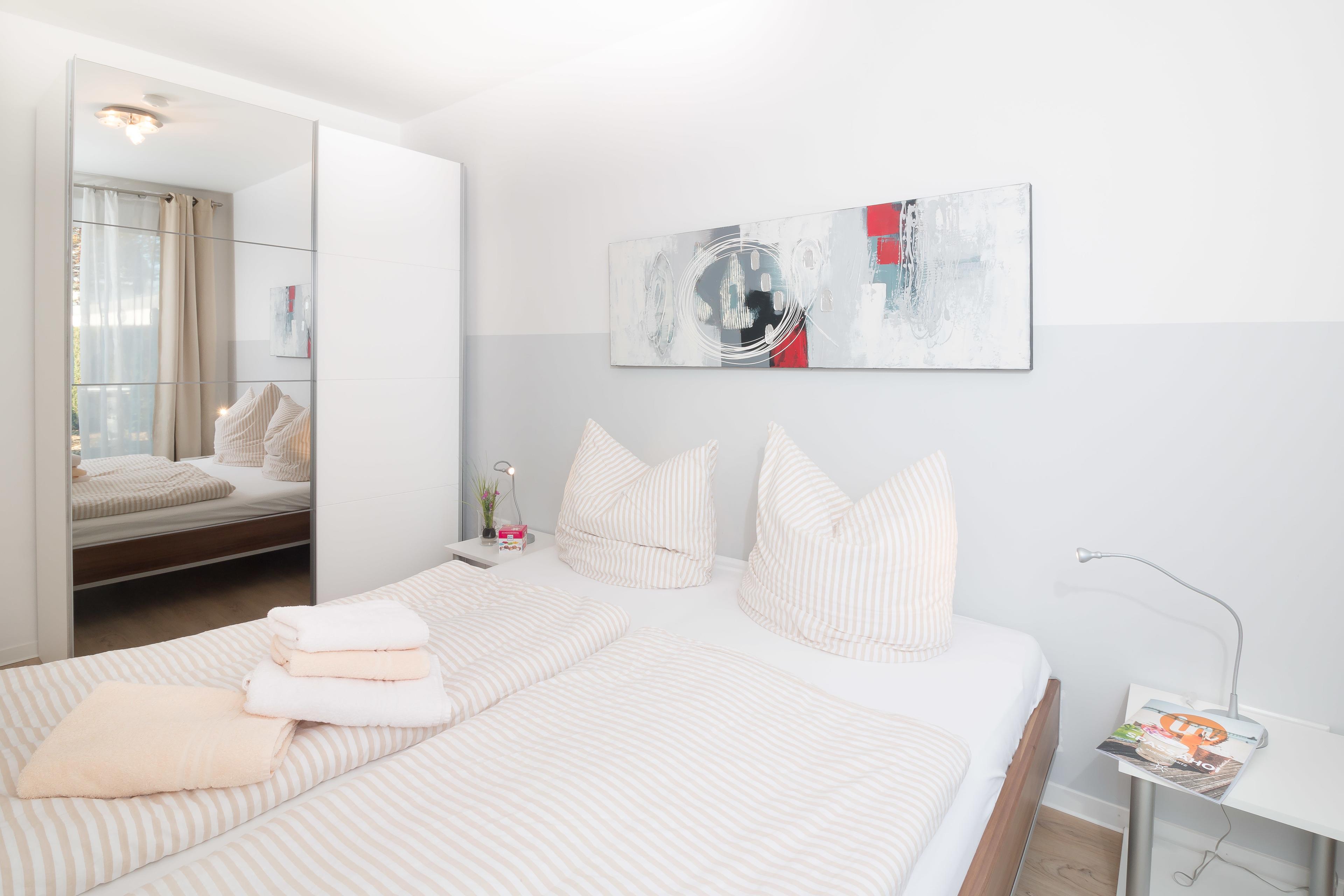 Im ersten Schlafzimmer ein Boxspring-Doppelbett (je 90 x 200 cm) und im zweiten Schlafzimmer ein Doppelbett mit Komfort-Lattenrosten (je 80 x 200 cm) und guten Matratzen sorgen für angenehmen Schlaf im Urlaub. Großzügige Kleiderschränke bieten ausreichend Stauraum.