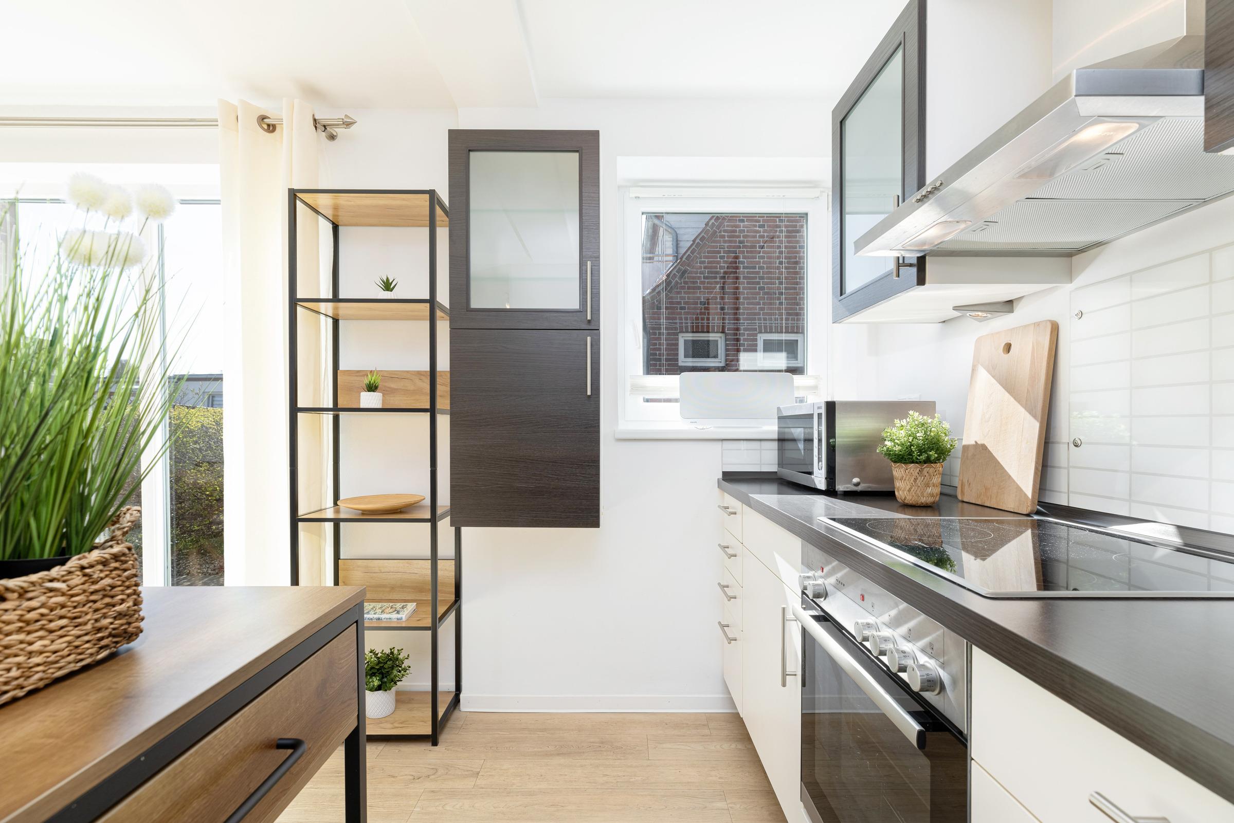 Am großen Design-Holzesstisch finden Sie in vier modernen Stühlen Platz. Gegenüber liegt die komfortabel ausgestattete Küchenzeile mit Geschirrspüler, 3-Sterne-Kühlschrank mit Gefrierfach und Herd mit Ceran-Kochfeld.