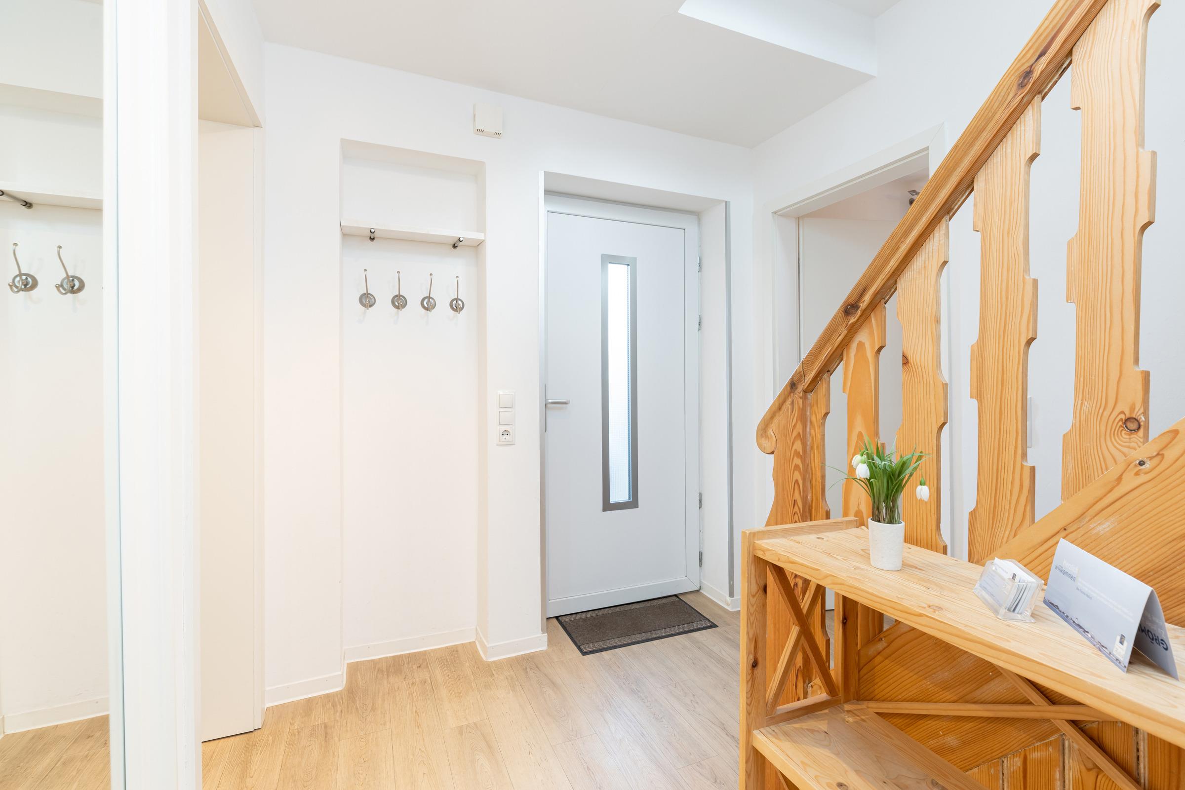 Aus dem Flur führt die Nostalgie-Treppe zur oberen Wohnebene. Echtleder-Wohnlandschaft zum Faulenzen und der große Esstisch mit 6 Stühlen in Nähe der hochwertigen Küchenzeile heben sich von dem dunkelbraunen holzfarbenen Design-Fußboden ab und verleihen dem Raum Kontrast und Atmosphäre. Eine Besucher-Schlafgalerie spendet dieser Ebene zusätzliche Helligkeit und Größe.