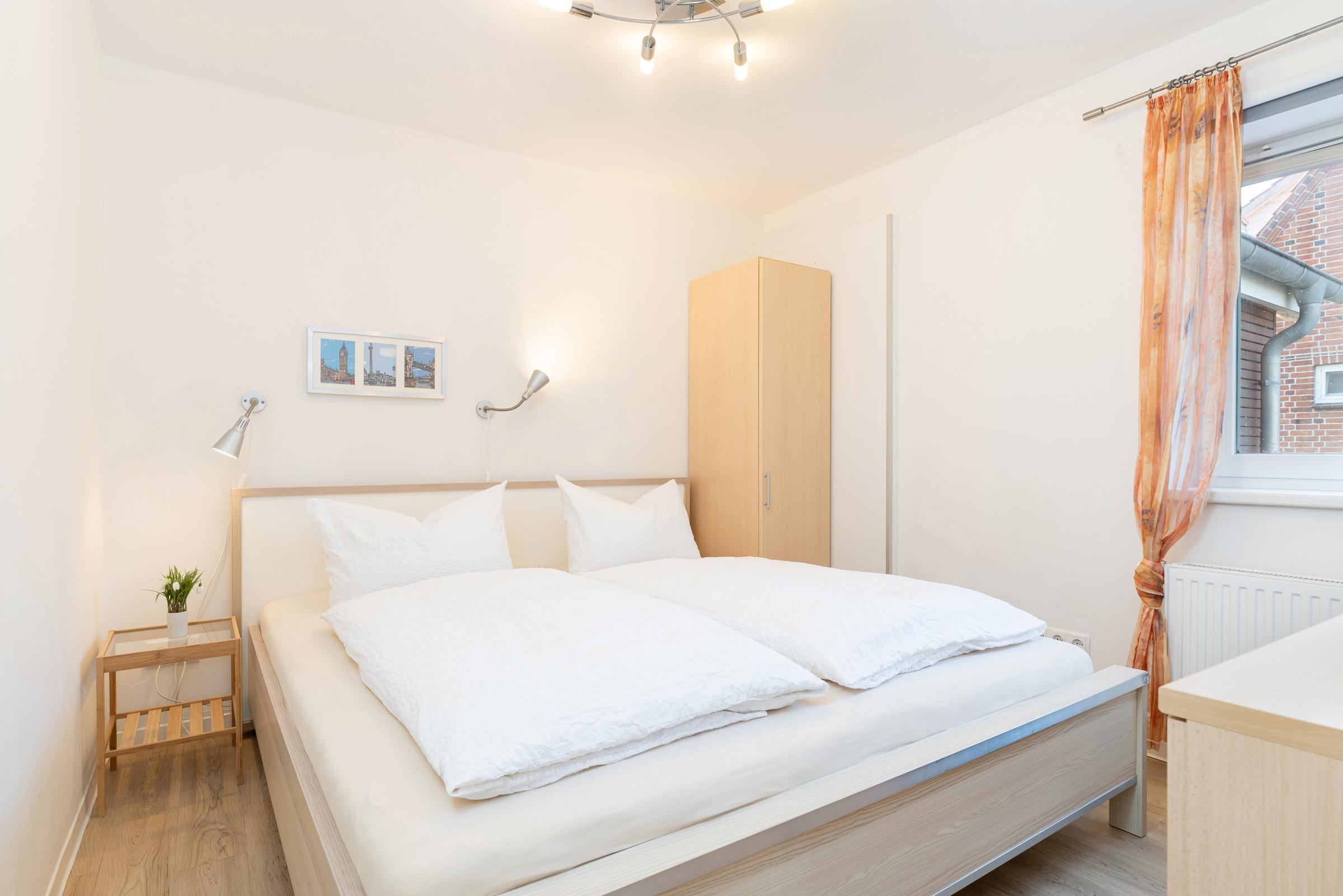 Parterre – 2 Schlafzimmer mit Boxspring-Doppelbett (180 x 200 cm), Wand-TV + Kleiderschrank, elegantes Bad mit Regendusche + Classic-Accessoires.