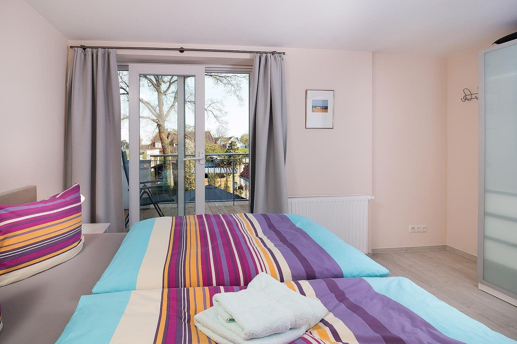 Die Schlafräume liegen im Obergeschoss. Ein Balkon gehört zum ersten Schlafzimmer, welches mit Boxspringbett (2 x 90 x 200 cm) und Kleiderschrank eingerichtet ist. Das zweite Zimmer hat zwei Betten je 90 x 200 cm und Kleiderschrank.