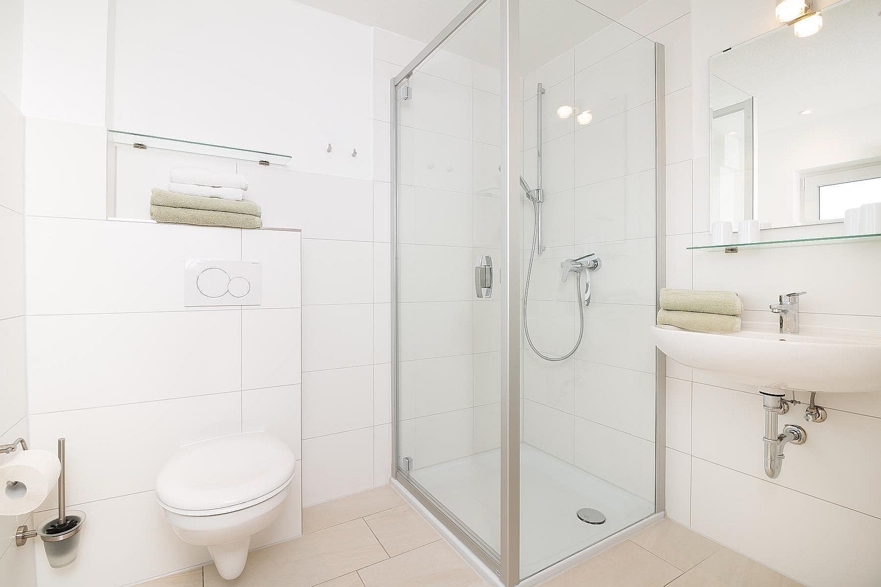Vom Flur aus gehen Sie ins Badezimmer mit Dusche und WC. Im kleinen Abstellraum finden Sie Besen, Staubsauger und Zubehör.