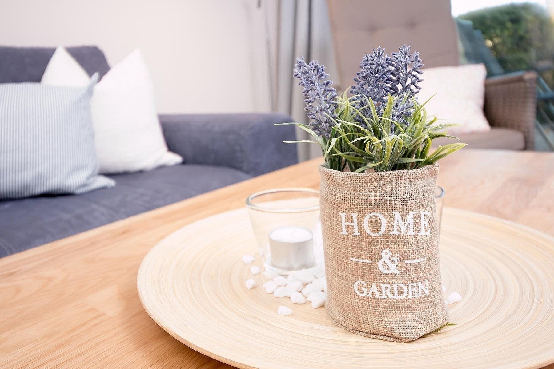 Geschickt dekorieren Gräser und Strandkorb Ihren Gartenbereich und verleihen eine maritime Stimmung. Im Wohnraum lädt ein modernes Ecksofa mit Ottomane und Bettfunktion zum Urlaubs-Faulenzen ein.
