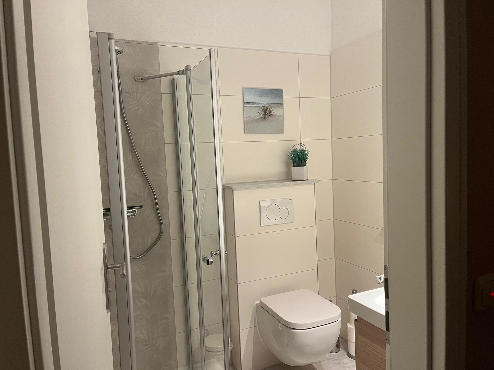 Vom Strandaufenthalt, sportlichen Aktivitäten und / oder ausgedehnten Wanderungen erschöpft können Sie sich in dem Wannenduschbad (1. OG) oder in der Dusche (Paterre) erfrischen.