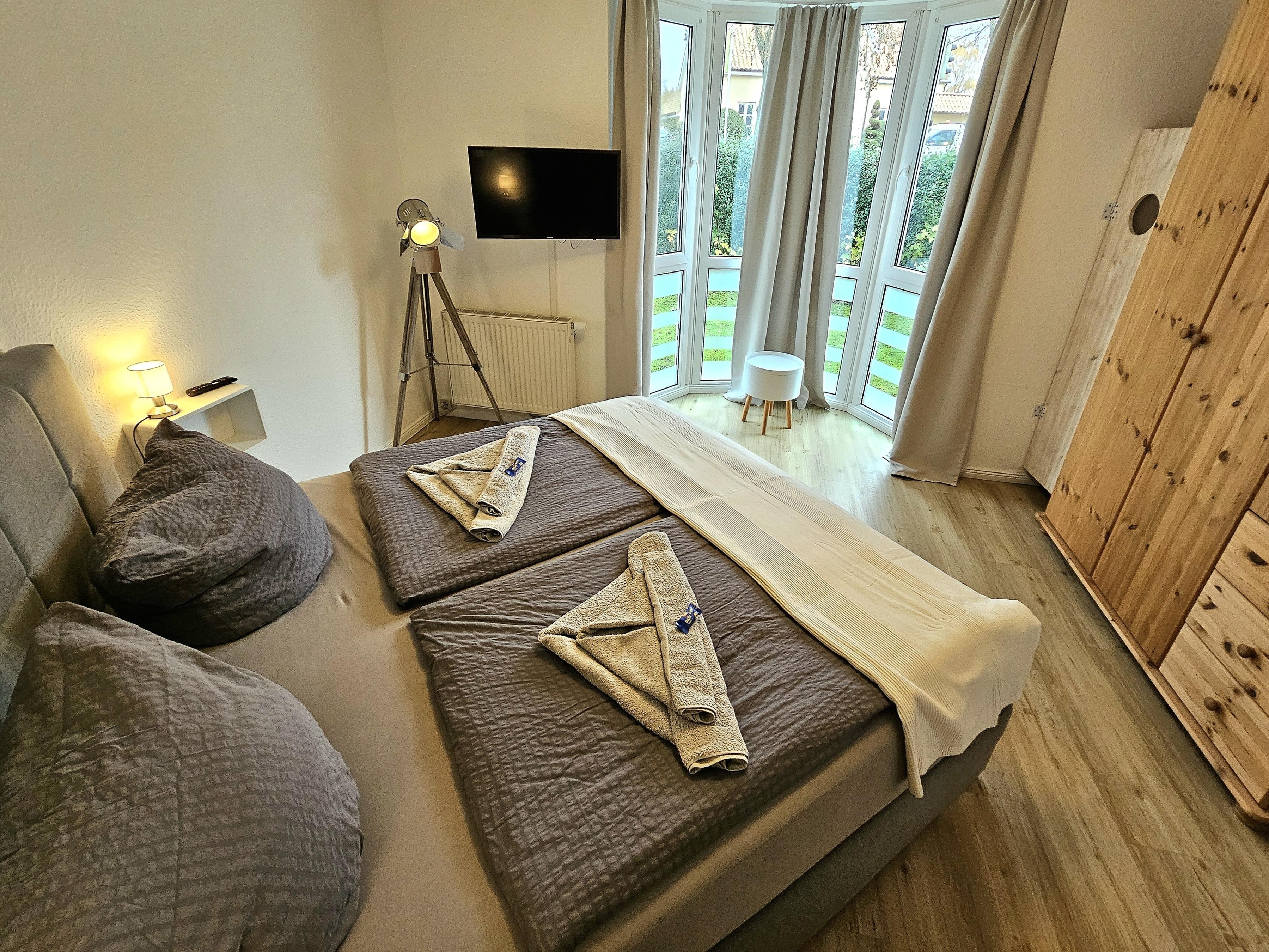 Das Schlafzimmer ist mit einem modernen Boxspringbett (180x200 cm), einem großen Kleiderschrank sowie einem zweiten TV-Gerät mit integriertem DVD-Player ausgestattet. Verdunkelungsvorhänge sind hier vorhanden.