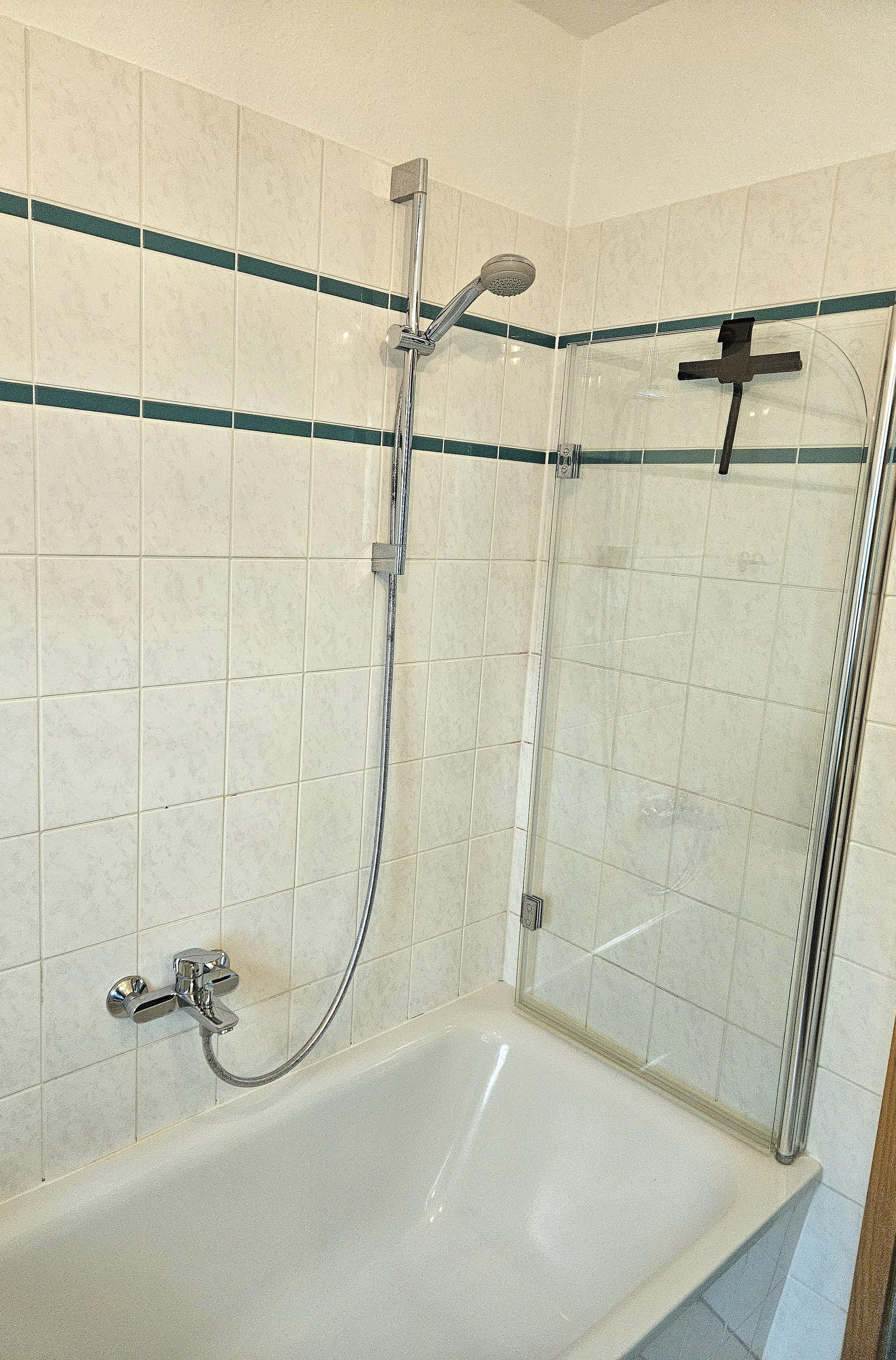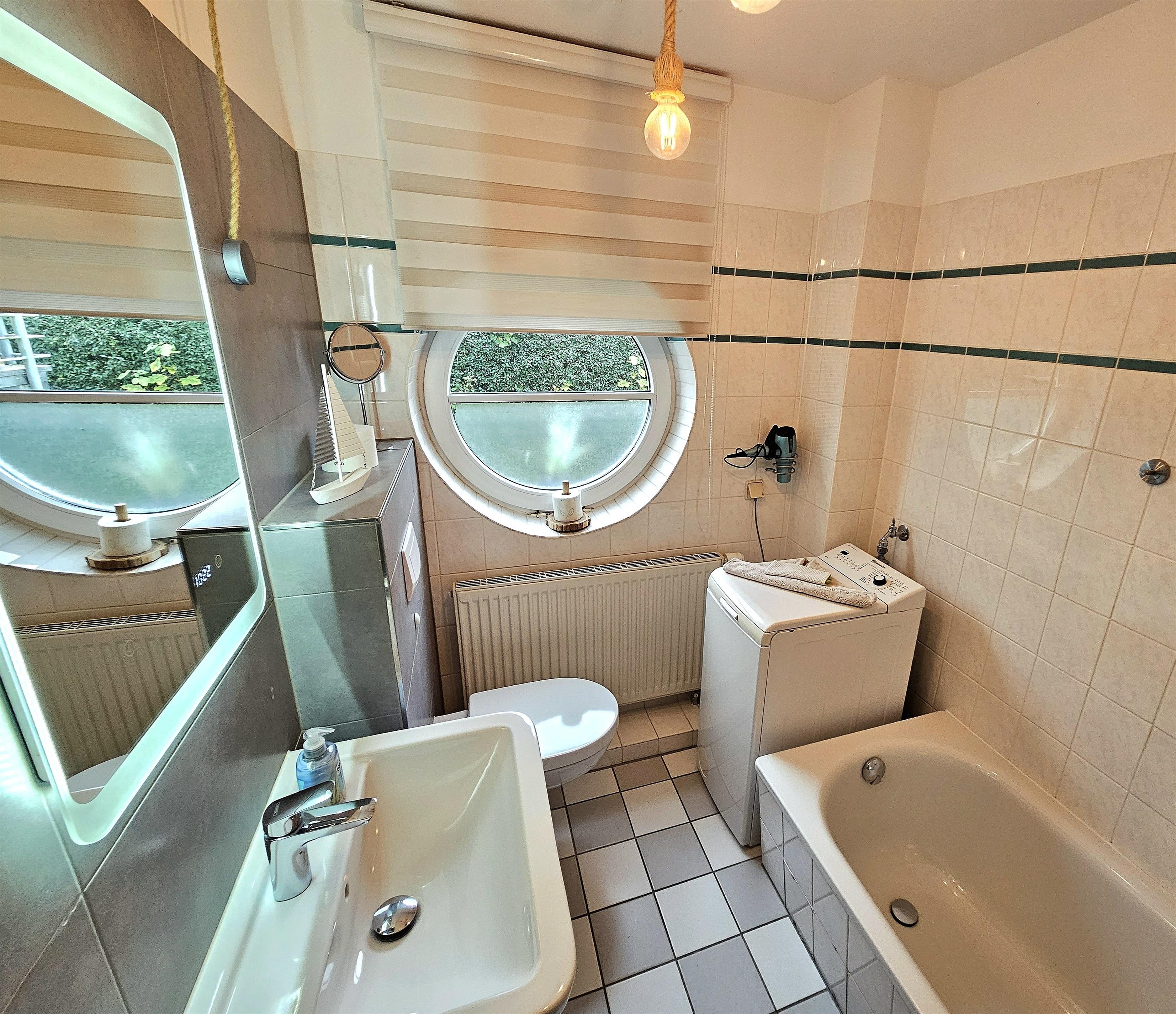 Das Tageslicht-Badezimmer ist mit WC, Waschbecken und Badewanne versehen, die dank der festen Duschwand auch als Dusche genutzt werden kann. Ein Haartrockner sowie eine Waschmaschine stehen zur kostenfreien Benutzung zur Verfügung.