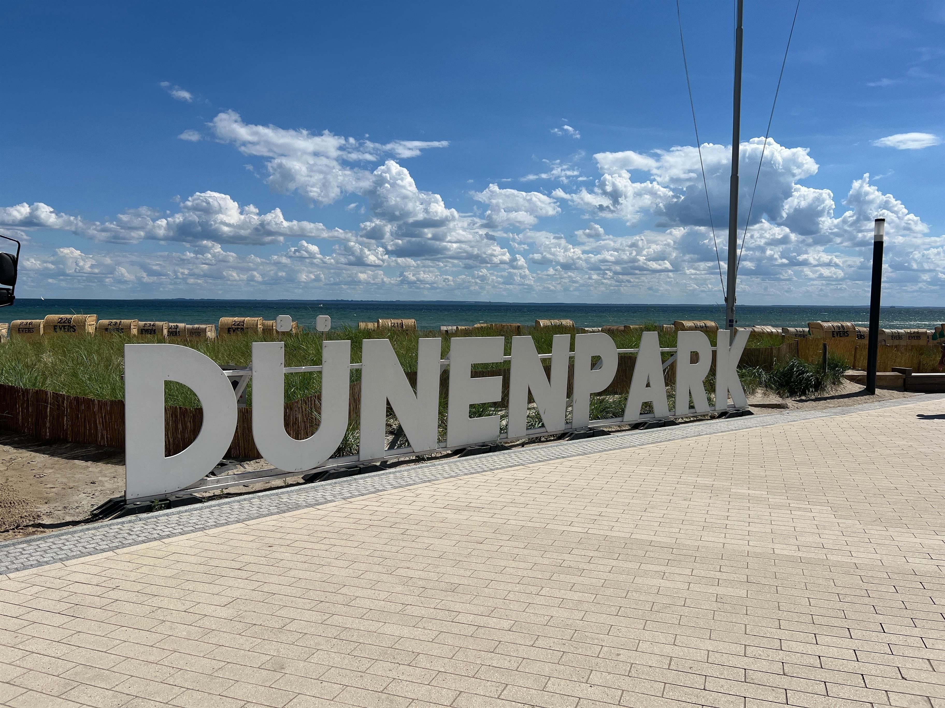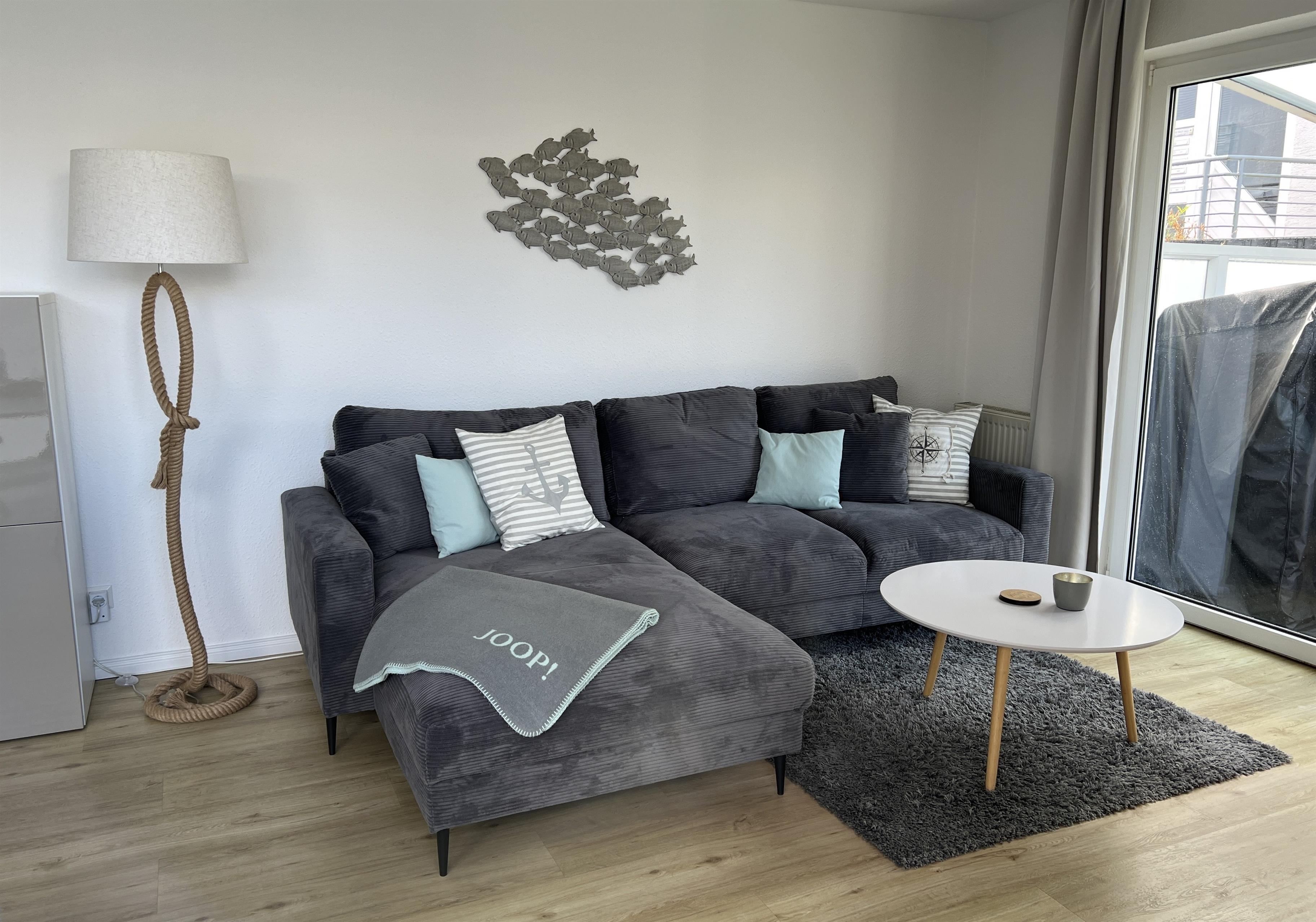 Modern eingerichtete Ferienwohnung WOLKENSTEIN in Grömitz mit Terrasse und Strandkorb, ideal für entspannte Urlaubstage zu zweit.