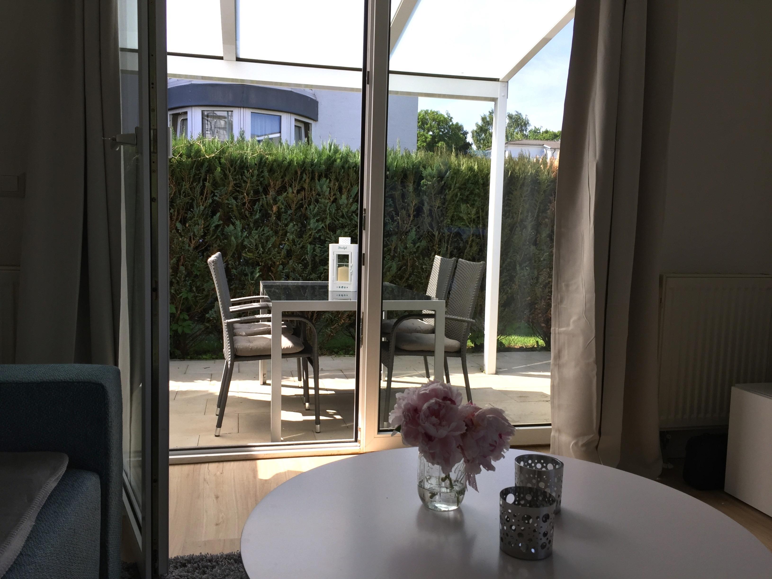 Vom Wohnbereich aus gelangen Sie zur möblierten, überdachten und windgeschützten Terrasse. Hier steht ein Strandkorb zum Entspannen bereit.