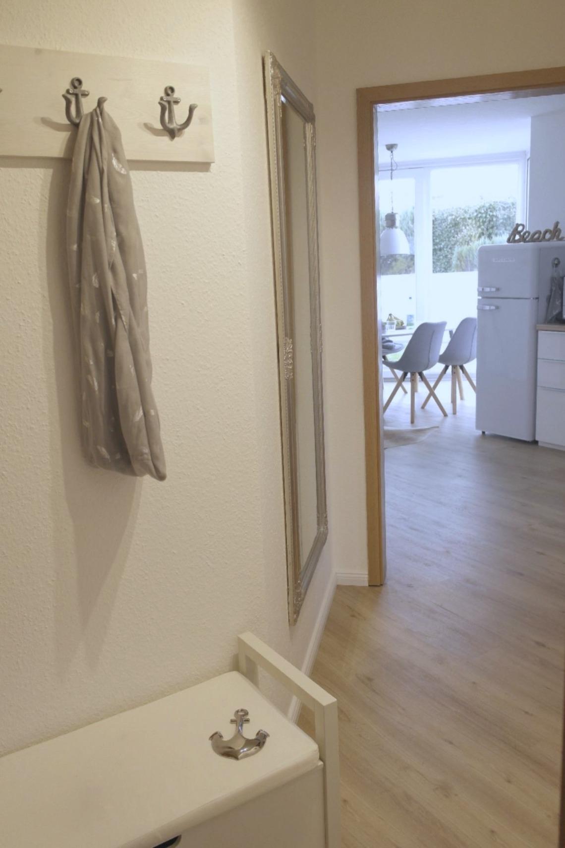 Die Wohnfläche der Unterkunft verteilt sich auf den offenen Wohnbereich mit Esszimmer und Einbauküche, ein separates Schlafzimmer sowie Flur und Badezimmer.