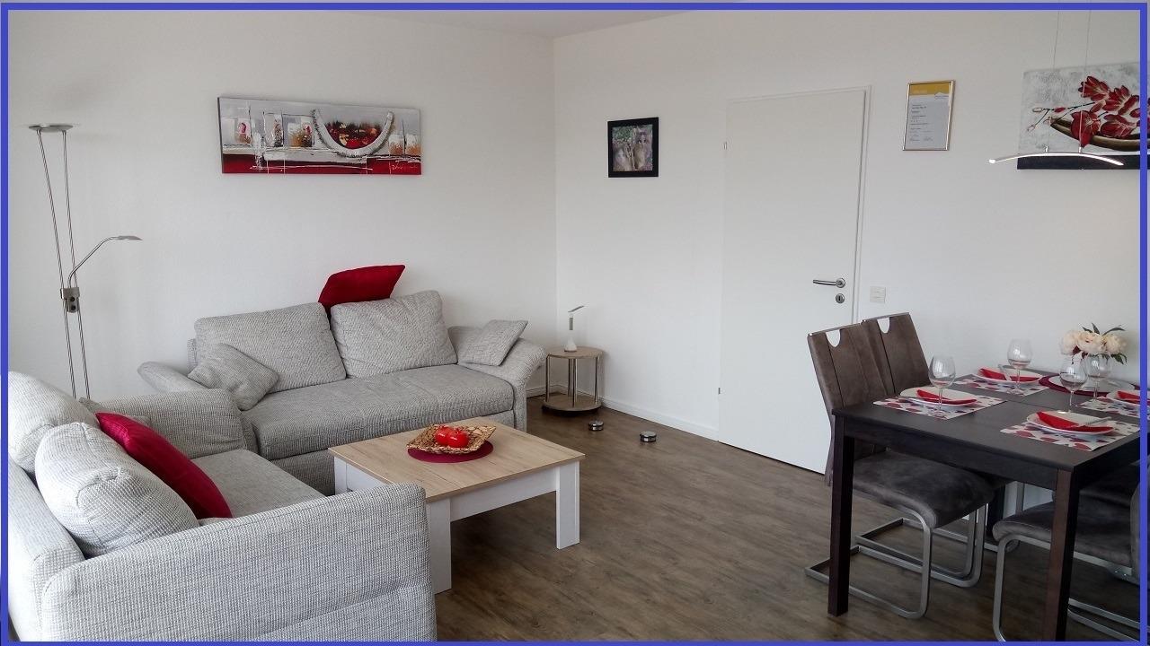 Die Wohnung liegt in der 2. Etage der Appartementanlage "Haus Baltic" und bietet ausreichend Platz für maximal 4 Personen. Die Gesamtfläche der ca. 49 m² (43 m² DIN) verteilt sich auf ein helles, sehr großzügiges Wohn-Ess-Zimmer, ein separates Schlafzimmer, eine separate Küche mit allem Komfort, ein helles Duschbad und einen Flur. Vom Flur aus gelangen Sie in das hell und freundlich eingerichtete Wohnzimmer mit einer Sitzecke (Schlafcouch von 1,40 x 2,00 m), sowie einem Essplatz für 4 Personen. Ein Flachbildfernseher (viele digitale Programme), ein CD-Player mit Radio, sowie ein W-Lan-Anschluss für den Internetzugang sind hier vorhanden. Es wurde natürlich auch daran gedacht, dass (falls es einmal regnet) für jeden eine Auswahl von CD's, Spiele und Bücher vorhanden sind. Vom Wohnzimmer aus haben Sie Zugang zum Süd-West-Balkon (ca. 7,5 m²), wo Sie bequem mit 4 Personen bis in den frühen Abend hinein die Sonne genießen können. Von hier haben Sie eine tolle Aussicht zum Deich mit einem unverbaubaren Blick in Richtung Ostsee. Die nagelneue Küche ist ausgestattet mit einem 4-Platten-Ceranfeld, einer Geschirrspülmaschine, einem Kühlschrank mit Gefrierfach, sowie einem Mikrowellengerät mit Grillfunktion. Natürlich sind auch diverse Küchengeräte, wie Kaffeemaschine, Eierkocher, Toaster, Wasserkocher, u.s.w. enthalten. Das separate Schlafzimmer ist mit einem Boxspringbett (1,40 x 2 m) für 2 Personen, 2 Nachttischchen, einem Kleiderschrank, sowie einem Herrendiener ausgestattet. Durch die vorhandenen Rollos kann es fast komplett abgedunkelt werden. Das Badezimmer ist zweckmäßig mit Dusche, WC und Waschtisch ausgestattet.