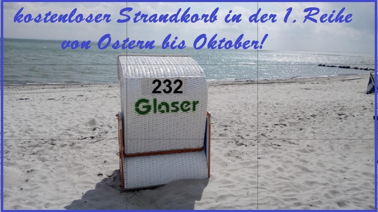 Während der Saison (Ostern bis Oktober) steht Ihnen ein kostenloser Strandkorb in der 1. Reihe zur Verfügung.