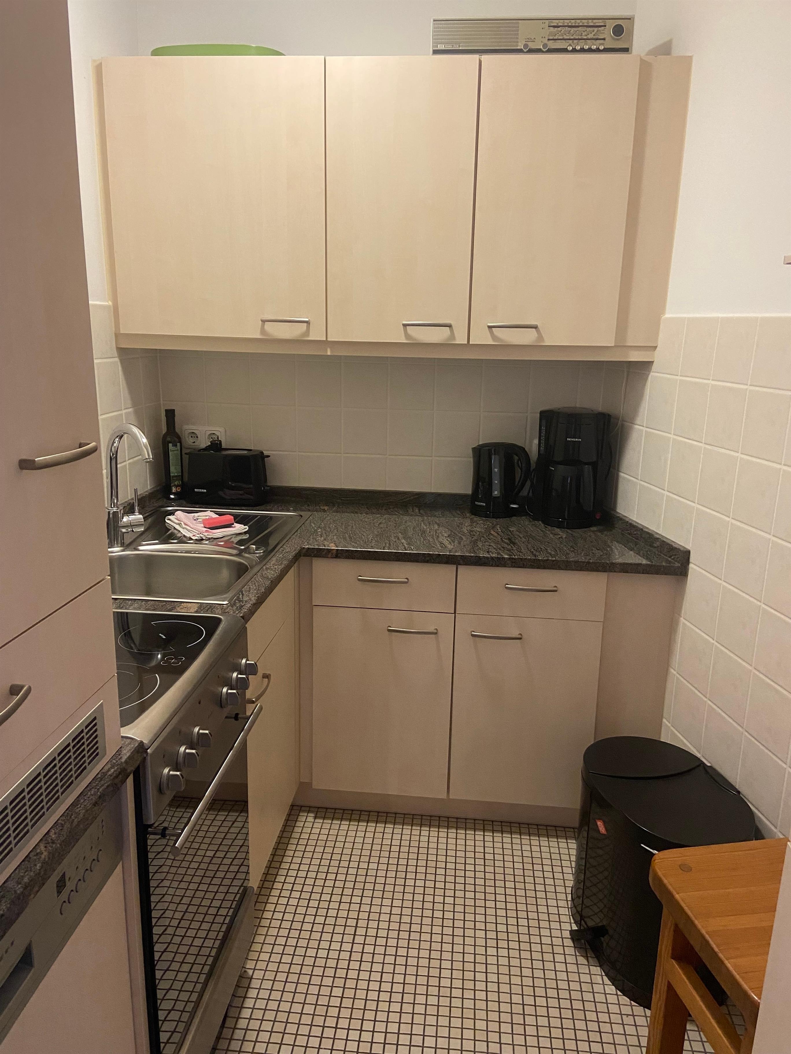 Das Schlafzimmer hat ein Doppelbett (1,60 m x 2 m breit, 2 Matratzen auf Lattenrosten, ohne Fußende), ein Tagesbett (0,90m x 2,00m), das sich gut zum Schlafen eignet sowie viel Schrankplatz. Die separate kleine Küche ist voll ausgestattetet mit 4-er Ceranfeld-Herd, Backofen, Kühl-Gefrierschrank und Spülmaschine. Das moderne Bad hat eine Klarglasdusche mit relativ niedrigem Einstieg, Handtuchheizung und WC.