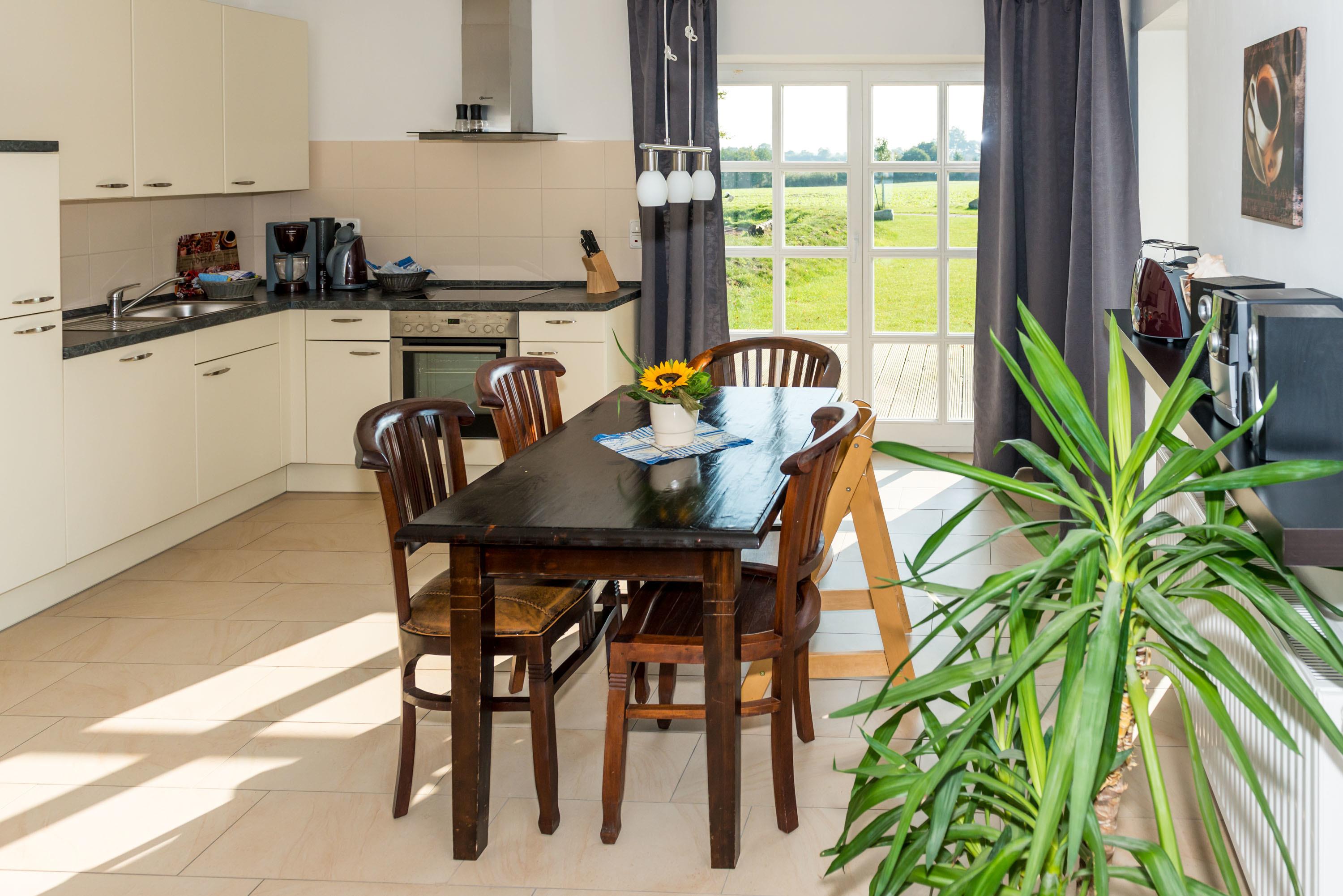 Im Backhaus genießen die Gäste modernen Komfort mit eigener Terrasse und Zugang zum Garten auf einer Ebene. Sie verfügen über ein Elternschlafzimmer mit Doppelbett und ein Kinderzimmer mit Hochbett und Einzelbett. Eine komplett ausgestattete Küche und das Badezimmer mit Badewanne und Dusche machen die Einrichtung komplett. Alle Urlauber, die sich für ein Ferienhaus entscheiden, bekommen das eigene Reich im Backsteinhaus und mit komplett eingerichteter Küche mit Mikrowelle, Backofen und Spülmaschine zur Verfügung gestellt. Auch das Wohnzimmer bietet mit Sat-TV, DVD-Player sowie WLAN und Schwedenofen moderne Bequemlichkeit. Bei schönem Wetter lockt eine große Hoplzterrasse mit gemütlichen Gartenmöbeln und Grillkarmin.