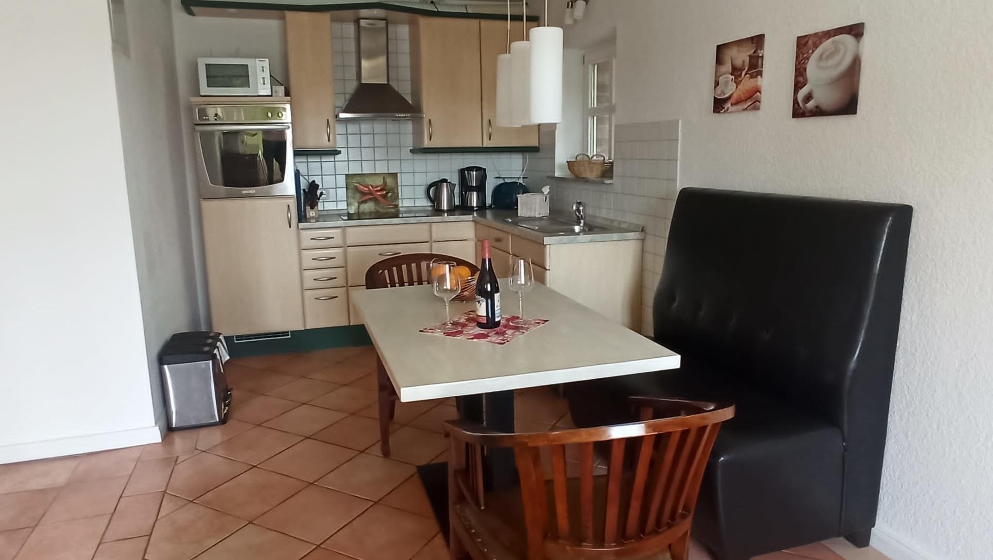Die Küche ist komplett eingerichtet mit Mikrowelle, Backofen und Spülmaschine uvm.. Auch das Wohnzimmer bietet mit Sat-TV, DVD-Player sowie WLAN moderne Bequemlichkeit.