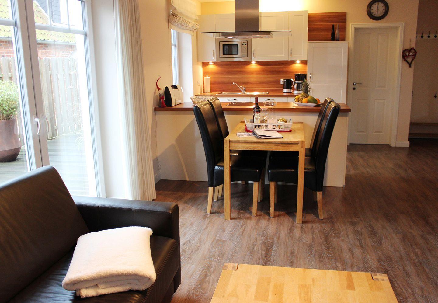 Die ruhig gelegene Erdgeschoss Wohnung 'Ankerplatz' mit 55 m² bietet jeglichen Komfort und Luxus für bis zu 2 Personen. Zur Ausstattung gehören: Bad mit Sauna & Whirlwanne, Schlafzimmer mit Doppelbett, offene voll ausgestattete Wohn- Küche, Ledercouch im Wohnzimmer, Flat TV, Blu Ray Player, kostenloser Internet und W-LAN Anschluss, Fußbodenheizung, Safe für Ihre Wertsachen, Ostterrasse mit hochwertigen Gartenmöbeln, Parkplatz direkt am Haus. Das Schlafzimmer mit einem Doppelbett lädt zum gemütlichen Schlafen ein und verfügt über ein zusätzliches Flachbild-TV. Die voll ausgestattete Küche bietet jeglichen Komfort: Spülmaschine, Kaffeemaschine, Toaster, Wasserkocher, Eierkocher, Mikrowelle, Kühl- und Gefrierschrank, Töpfe, Pfannen, Geschirr, Besteck, Salz, Pfeffer, Aluminiumfolie, Backpapier etc. Im Wohnzimmer erwartet Sie ein Flachbildschirm mit DVD Recorder, ein kostenloser WLAN Anschluss um immer Up to Date zu sein, ein dänischer Kaminofen inklusive Holz und die Fußbodenheizung für wohlige Wärme an kalten Tagen. Die Terrasse mit hochwertigen Gartenmöbeln und einem Strandkorb lädt zum Verweilen in der Sonne ein. Alle vier Wohnungen sind Nichtraucherobjekte, allergikergerecht und voll ausgestattet. Wir legen sehr großen Wert auf einen hohen Sauberkeitstandard! Bei uns inklusive: Die Bettwäsche ist bereits im Preis enthalten und auch Strom, Wasser, Heizung, Kaminholz, Anzünder und Feuerzeug, alle Putzmittel (inkl. Geschirrspültabs), Hand-, Dusch- und Saunatücher, sowie Tischwäsche, Toilettenpapier und Küchenrolle. Auf Wunsch legen wir Ihnen Bademäntel (gegen Kaution) in die Wohnung. Ein abschließbarer Abstellraum für Ihre mitgebrachten Fahrräder ist vorhanden, auf Wunsch können Sie bei uns einen Bollerwagen leihen.