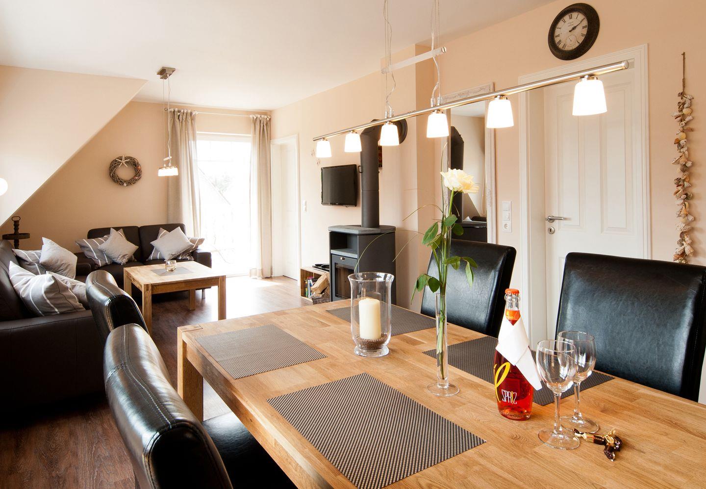 Die Wohnung ist hell und freundlich eingerichtet. Die hochwertige Ausstattung wurde mit viel Liebe zum Detail ausgewählt. Wohlige Entspannung finden Sie in Ihrem eigenen Wellnessbereich. Genießen Sie einen belebenden Saunagang oder relaxen Sie im wohnungseigenen Whirlpool - in unserem Dünenhaus stehen alle Zeichen auf Erholung. Und was gibt es Schöneres, als gemeinsam den Abend vor dem Kamin ausklingen zu lassen? Der Balkon der Wohnung ist mit gemütlichen Liegen ausgestattet, die zum ausgiebigen Sonnenbaden einladen. Außerdem verfügt sie über einen Grill auf dem Grillplatz, auf dem Sie nach Herzenslust knackige Würstchen brutzeln können. Ein Handtuch- und Bettwäsche Service ist ebenfalls inklusive. Gegen Gebühr: Bei uns haben Sie die Möglichkeit, im Keller des Hauses Ihre Wäsche zu waschen und zu trocknen.