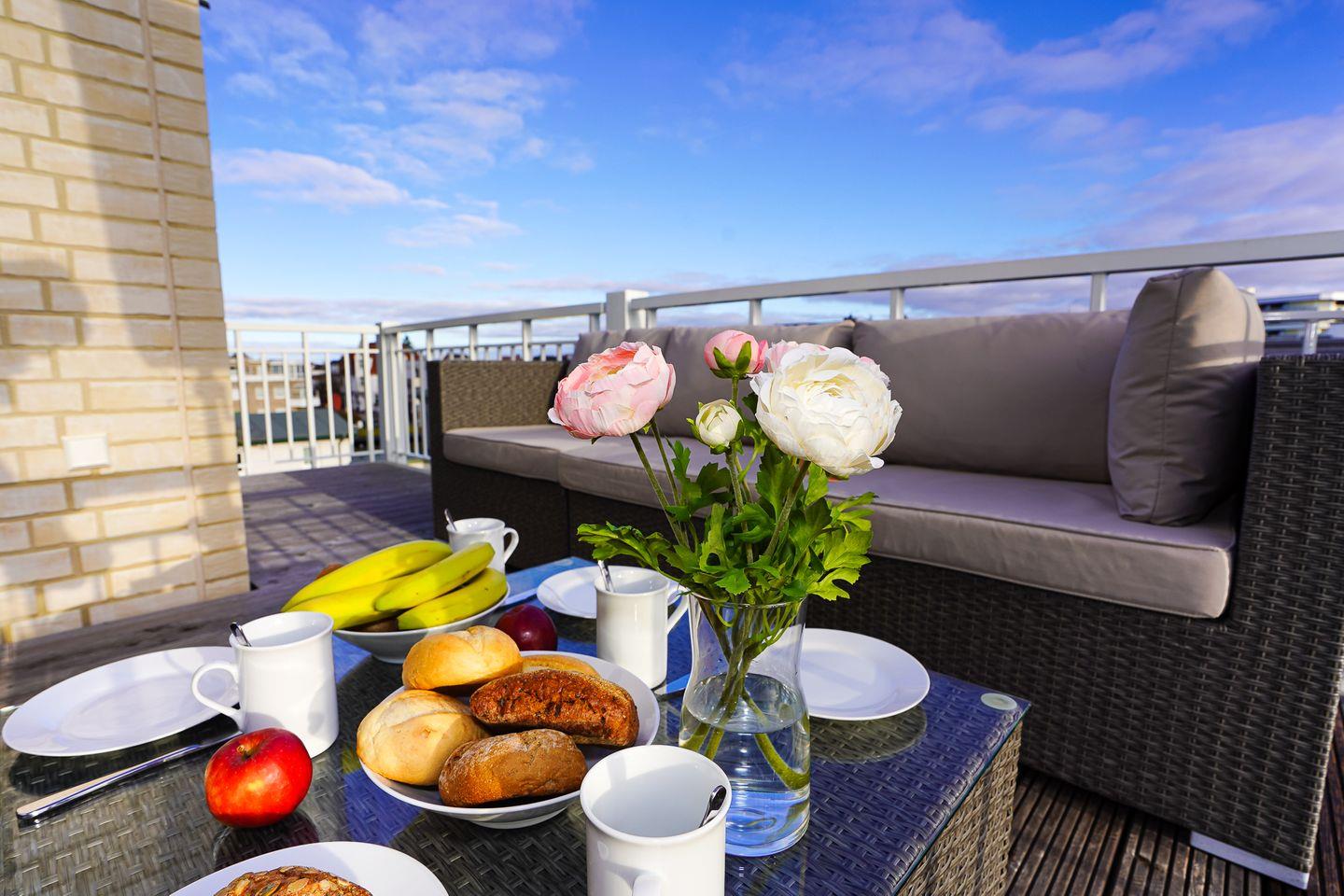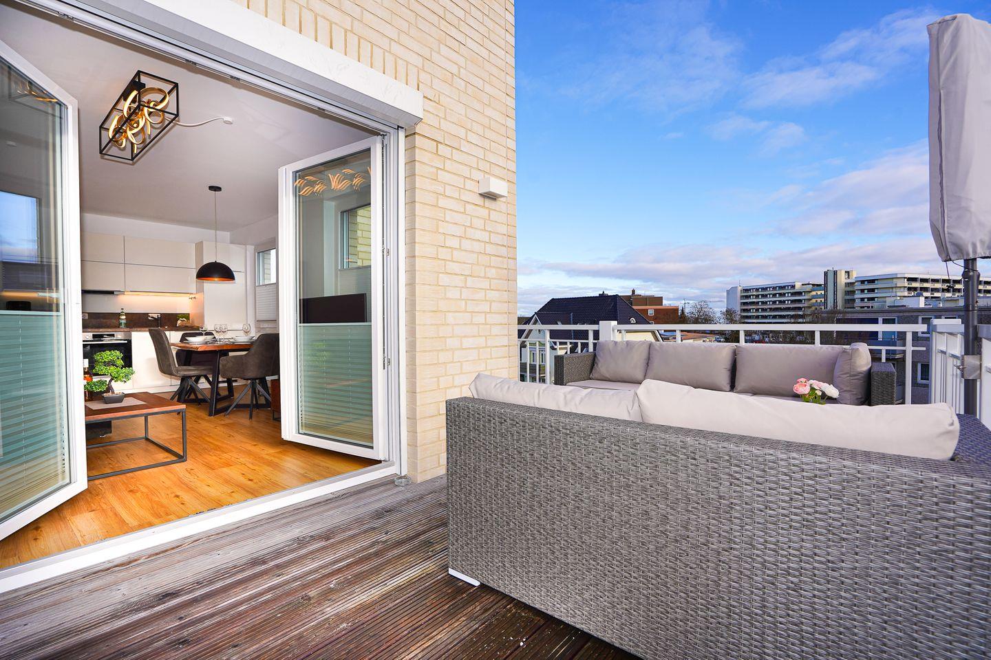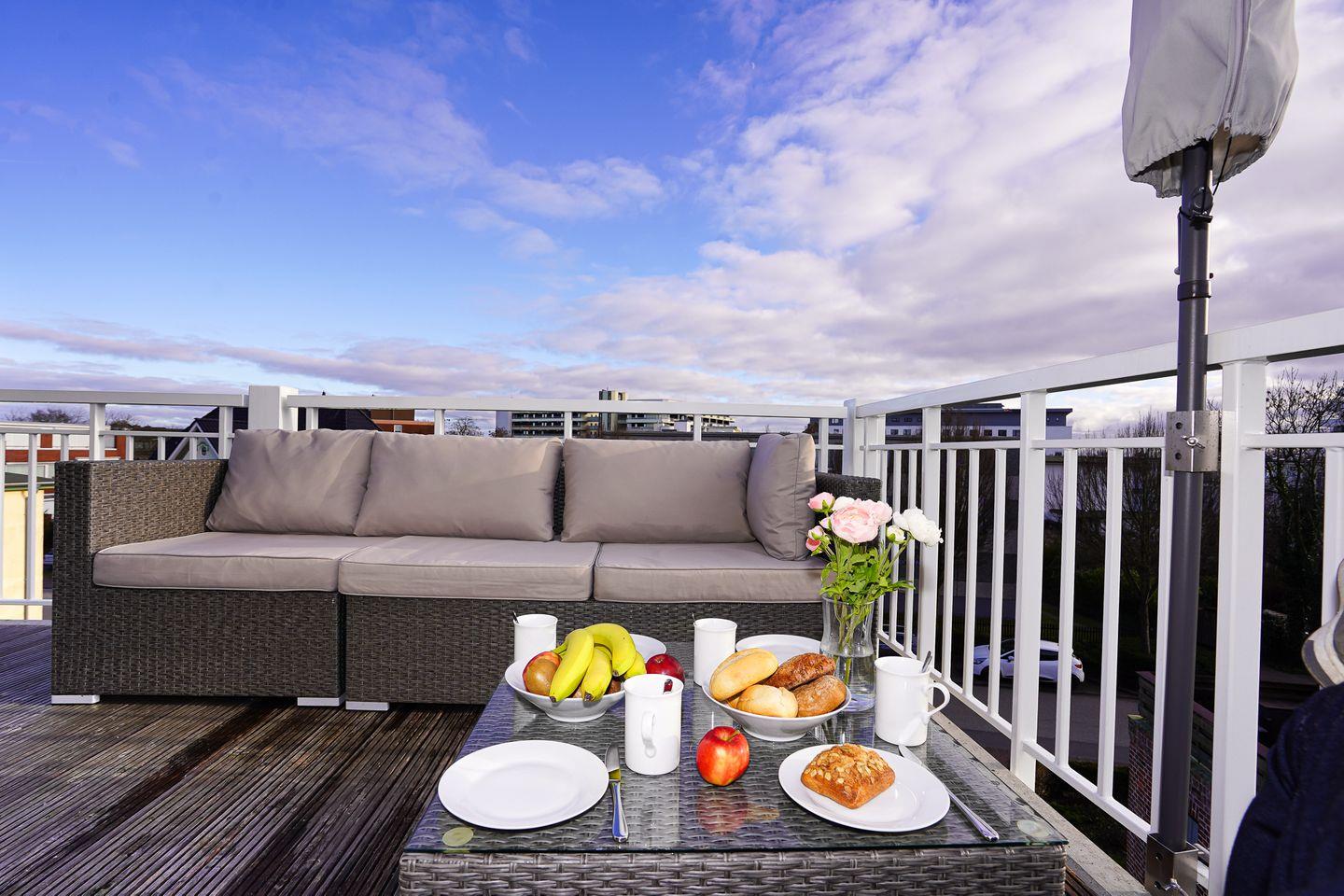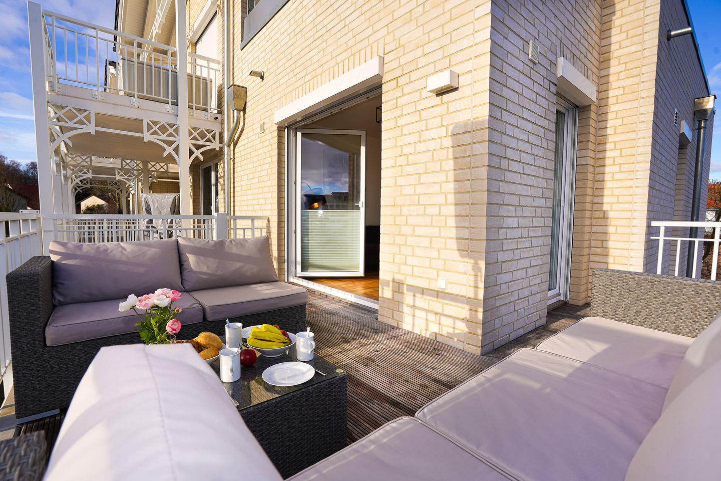 Auf dem schönen großzügigen Süd-/Westbalkon mit Sitzmöbeln, Aufbewahrungsbox und Strandkorb können Sie jederzeit wunderbar entspannen und genießen.