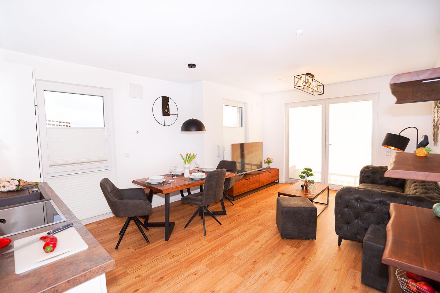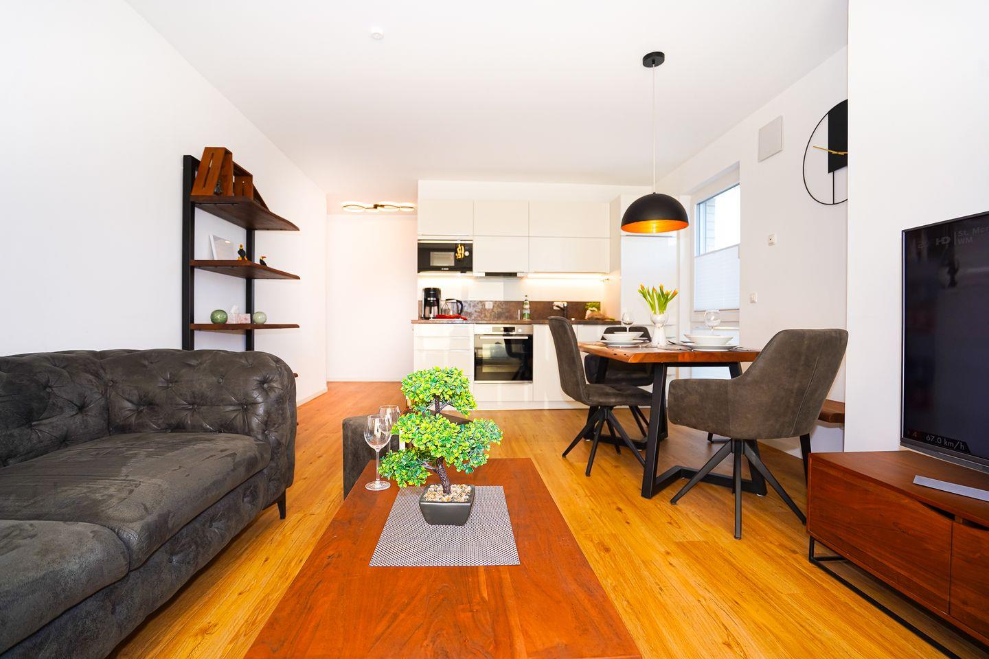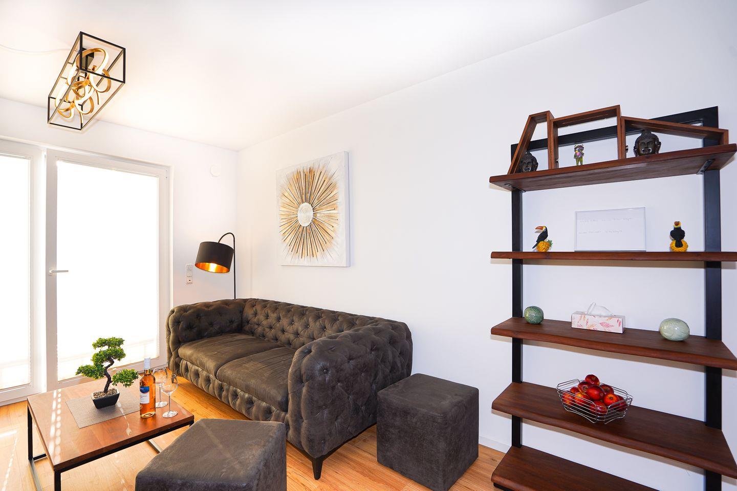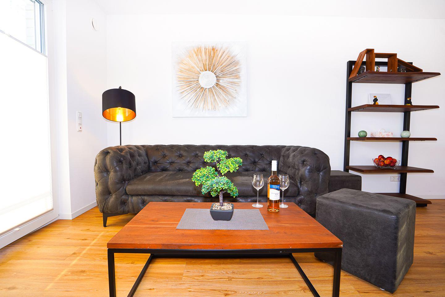 Ihr Wohnbereich wurde sehr geschmackvoll und mit Liebe zum Detail für Sie gestaltet. Zahlreiche Accessoires sowie hochwertiges Mobiliar im Modern Style schaffen eine besonders schöne Wohnatmosphäre. Flat-TV, WLAN, verstehen sich von selbst.