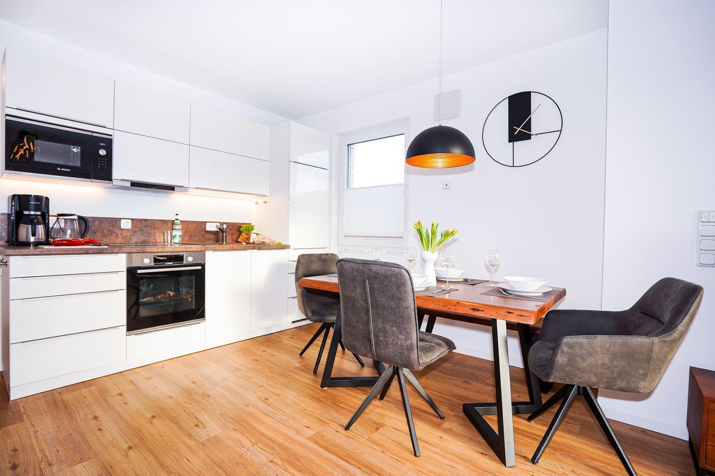 Ihre moderne Design-Küche im edlen Weiß verwöhnt Sie mit Cerankochfeld, Mikrowelle, Backofen, Geschirrspüler sowie einer Kaffeemaschine, Wasserkocher und Toaster. Ihr Bad bietet Ihnen eine ebenerdige Dusche, WC und Waschtisch. Ein beheizter Handtuchhalter versteht sich von selbst. Für Kleinkinder steht ein Kinderstuhl zur Verfügung.