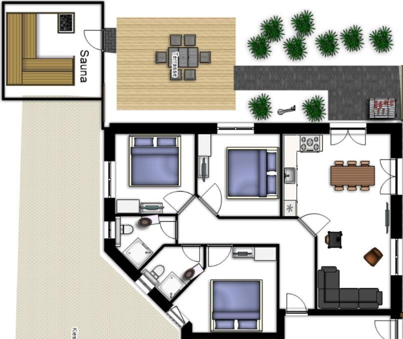 Moderne, geschmackvoll eingerichtete Ferienwohnung im Erdgeschoss mit drei Schlafzimmern, zwei Duschbädern, einem Wohnzimmer mit offener Küche, großer Terrasse und eigener Sauna und ausreichend Platz für 6 Personen.