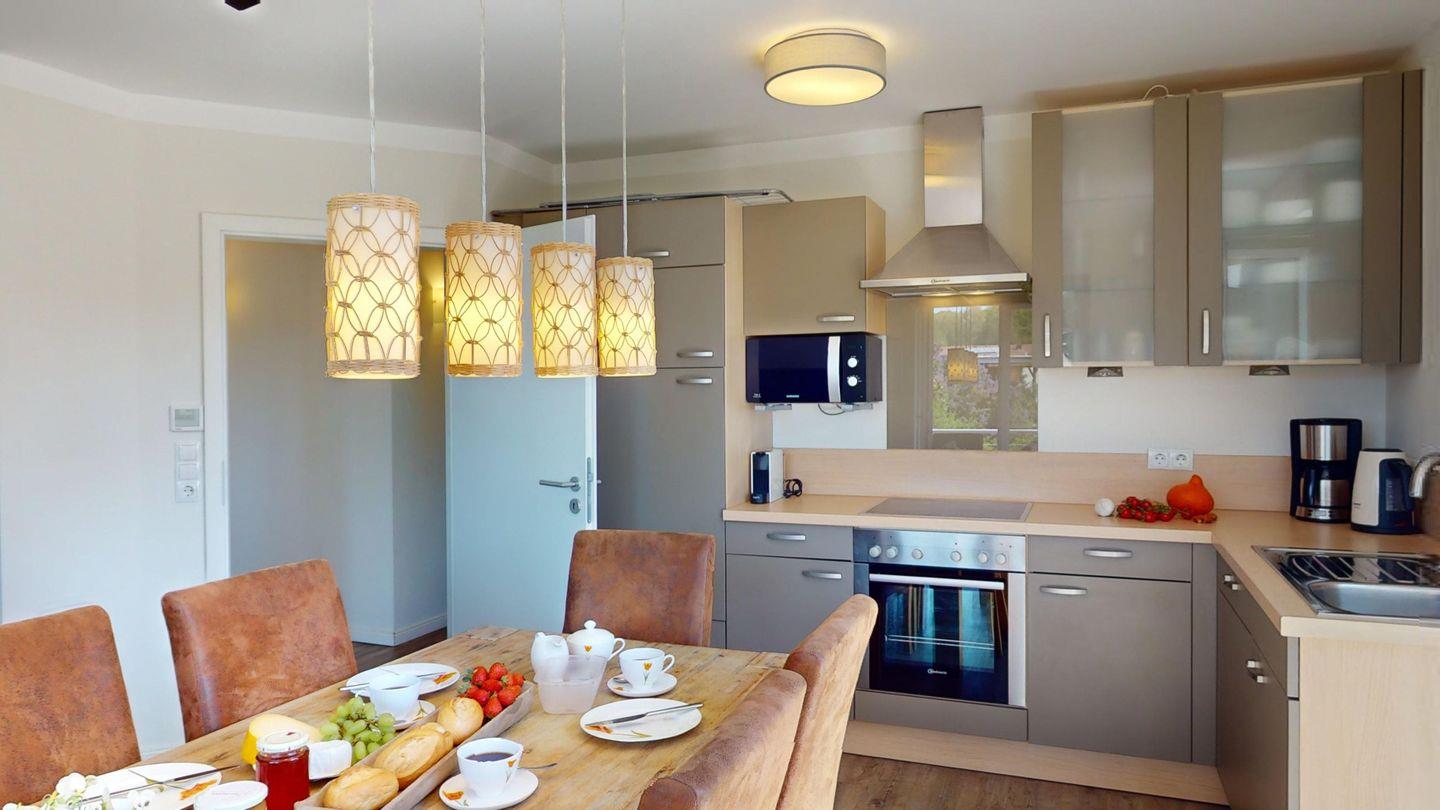 Eine offene Küche, ein Essbereich sowie eine gemütliche Sofaecke mit Kaminofen laden Sie ein, Ihren Urlaub in vollen Zügen zu genießen!