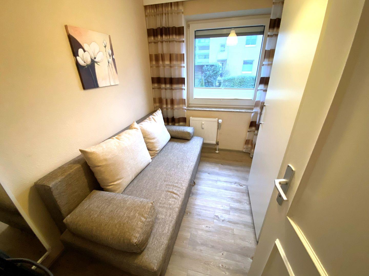 Die Wohnfläche der ca. 48 m² großen Wohnung verteilt sich auf ein gemütliches Wohnzimmer mit Essecke - von hier aus haben Sie Zugang zum möblierten Balkon - ein separates Schlafzimmer sowie Küche, Flur, zweites kleines Schlafzimmer (Schlafcouch) und Badezimmer.