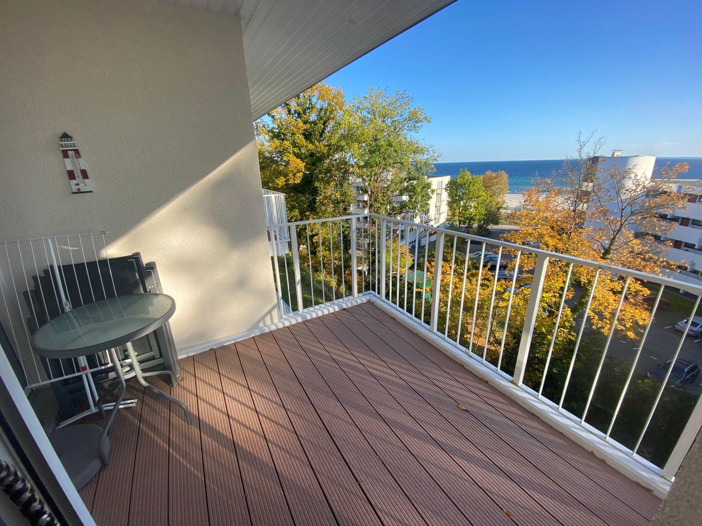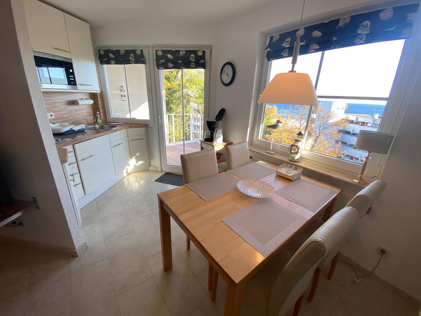 Vom Essbereich aus genießen Sie einen wunderbaren Blick auf die Ostsee. Hier befindet sich auch ein weiterer Zugang zum Balkon. Dieser ist möbliert und überdacht und bietet somit Schutz vor Sonne, Wind und Regen. Um mit Ihren Lieben in Verbindung zu bleiben können Sie den kostenfreien WLAN Zugang nutzen.