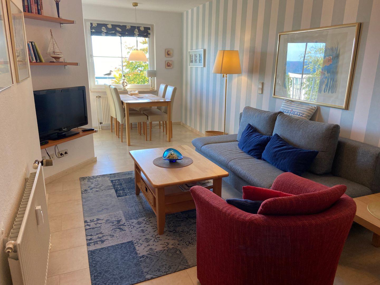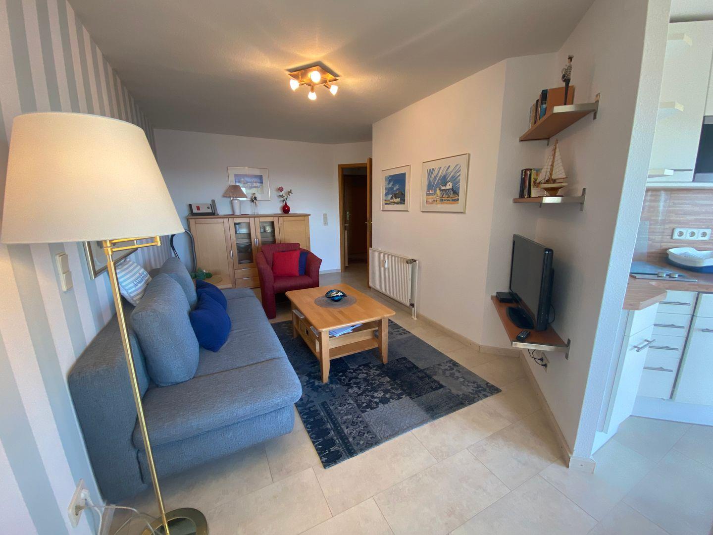 Der gemütliche Wohn- und Essbereich bildet das Herzstück der Ferienwohnung. Hier lässt sich´s abends einen gemütlichen Fernsehabend auf dem Sofa verbringen und wenn Sie zu Dritt anreisen, lässt sich das Sofa ganz einfach zum Bett umfunktionieren.