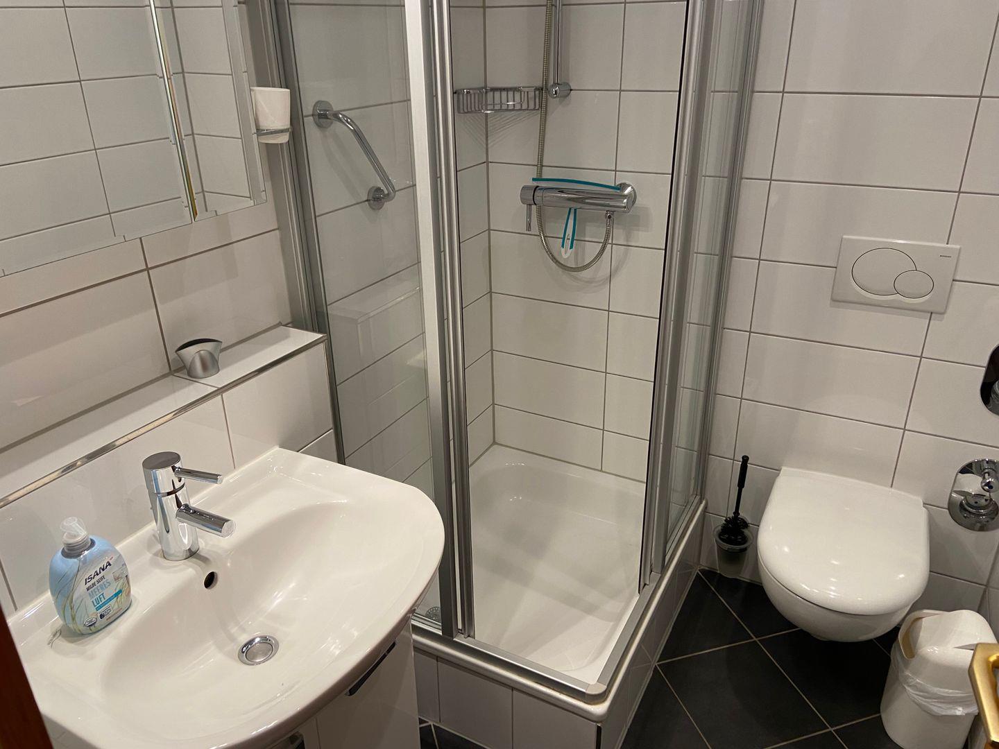 Das hell geflieste Badezimmer ist mit einer Dusche, Waschbecken, WC und Föhn ausgestattet.