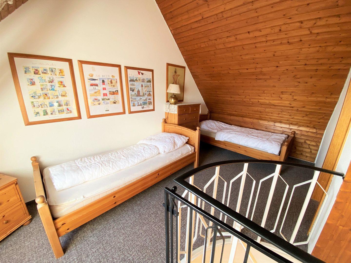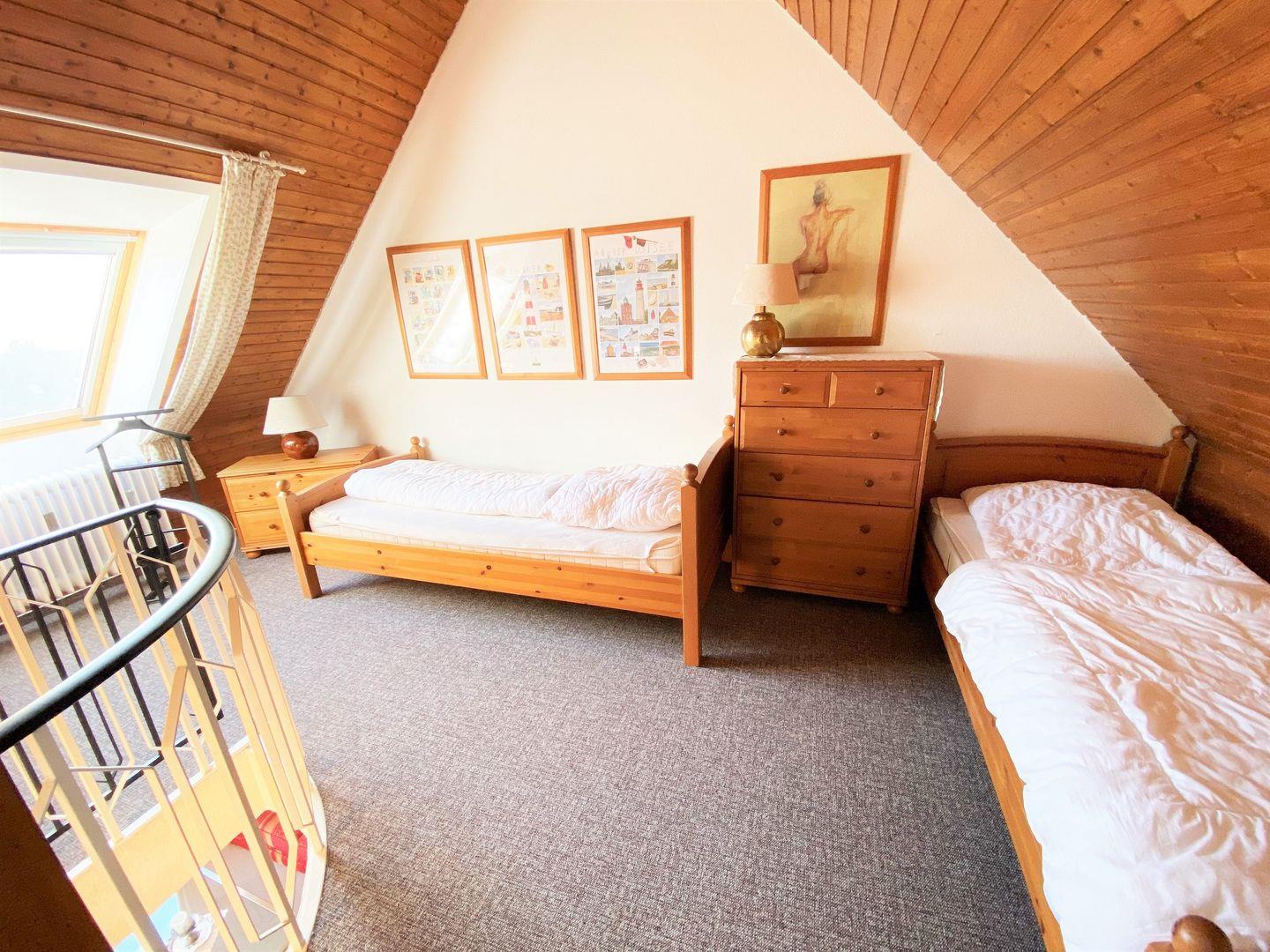 Über eine Wendeltreppe vom Wohnzimmer gelangen Sie auf die zweite Wohnebene mit einem offenem Gästezimmer mit zwei Einzelbetten, Kommode und Verdunkelungsmöglichkeit und separaten Schlafzimmer mit Doppelbett, Kleiderschrank, Flachbildschirm und Verdunkelungsmöglichkeiten.