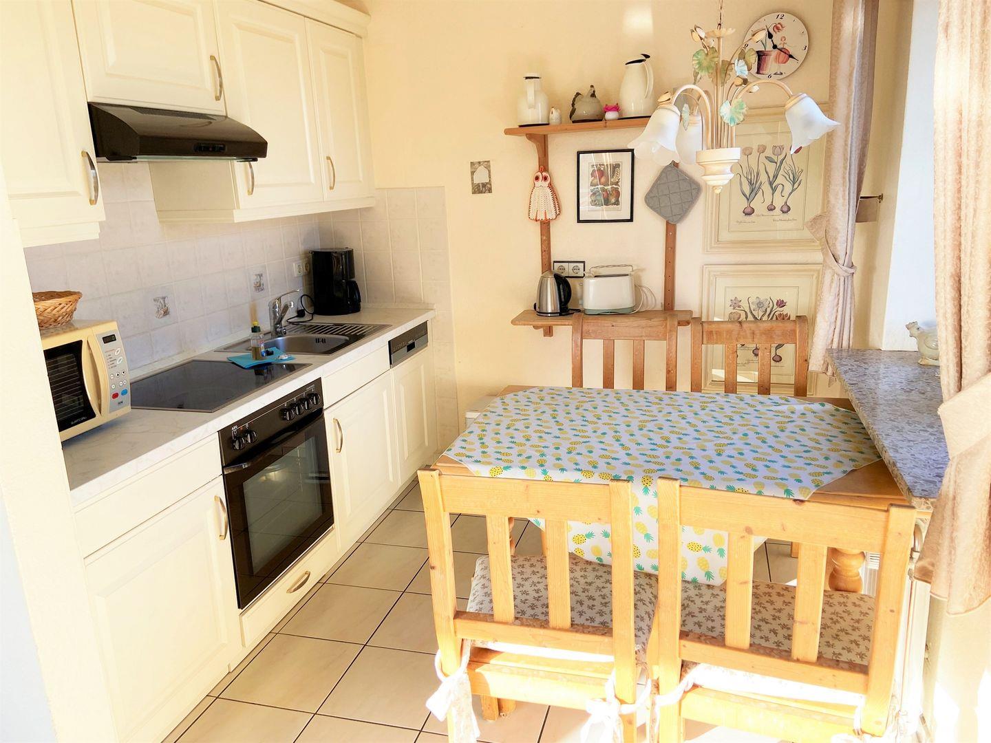 Dort steht ein Esstisch für 4 Personen. Die in weiß gehaltene Küche hat ein einen 4 Platten-Ceran Herd mit Backofen, ein Kühlschrank mit Gefrierfach, eine Geschirrspühlmaschine, Kaffeemaschine, Toaster und Wasserkocher. Der Bodenbereich ist gefliest.