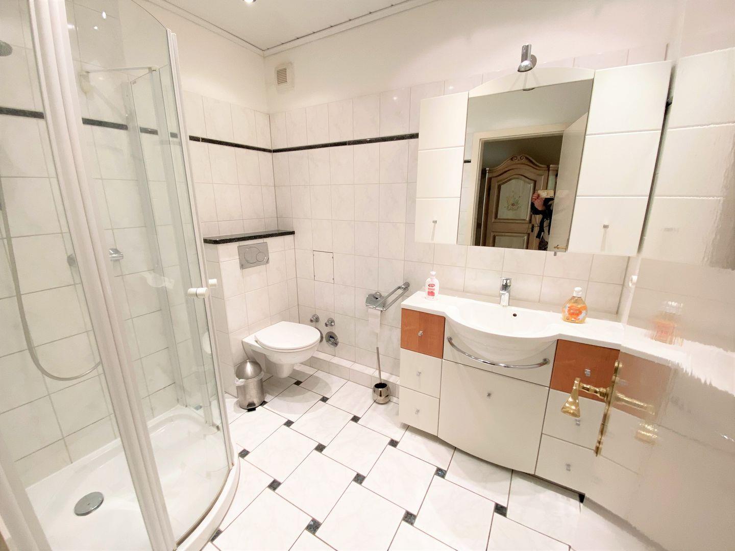 Das Badezimmer ist hell und modern eingerichtet. Eine bodentiefe Dusche, ein Spiegelschrank und ein großzügiger Waschtisch lassen keine Wünsche offen. Das Bad ist mit hellen Fliesen ausgelegt.