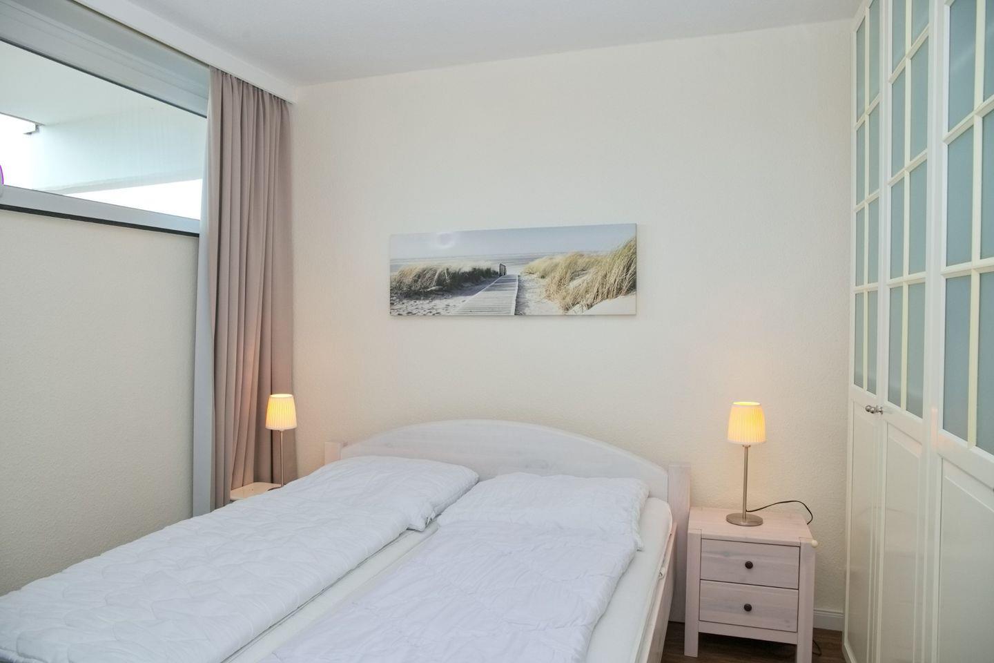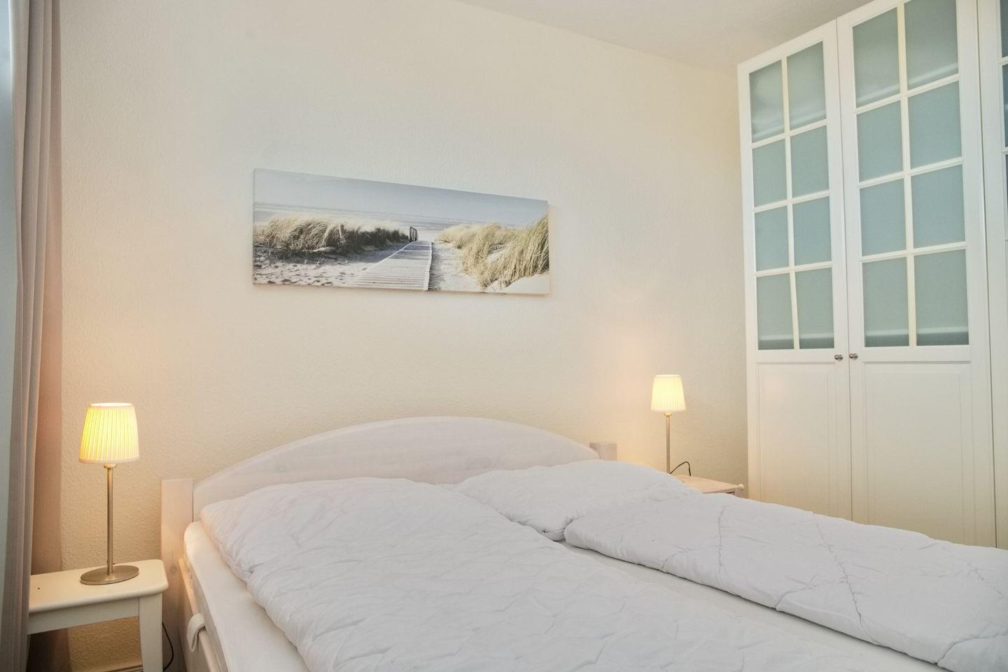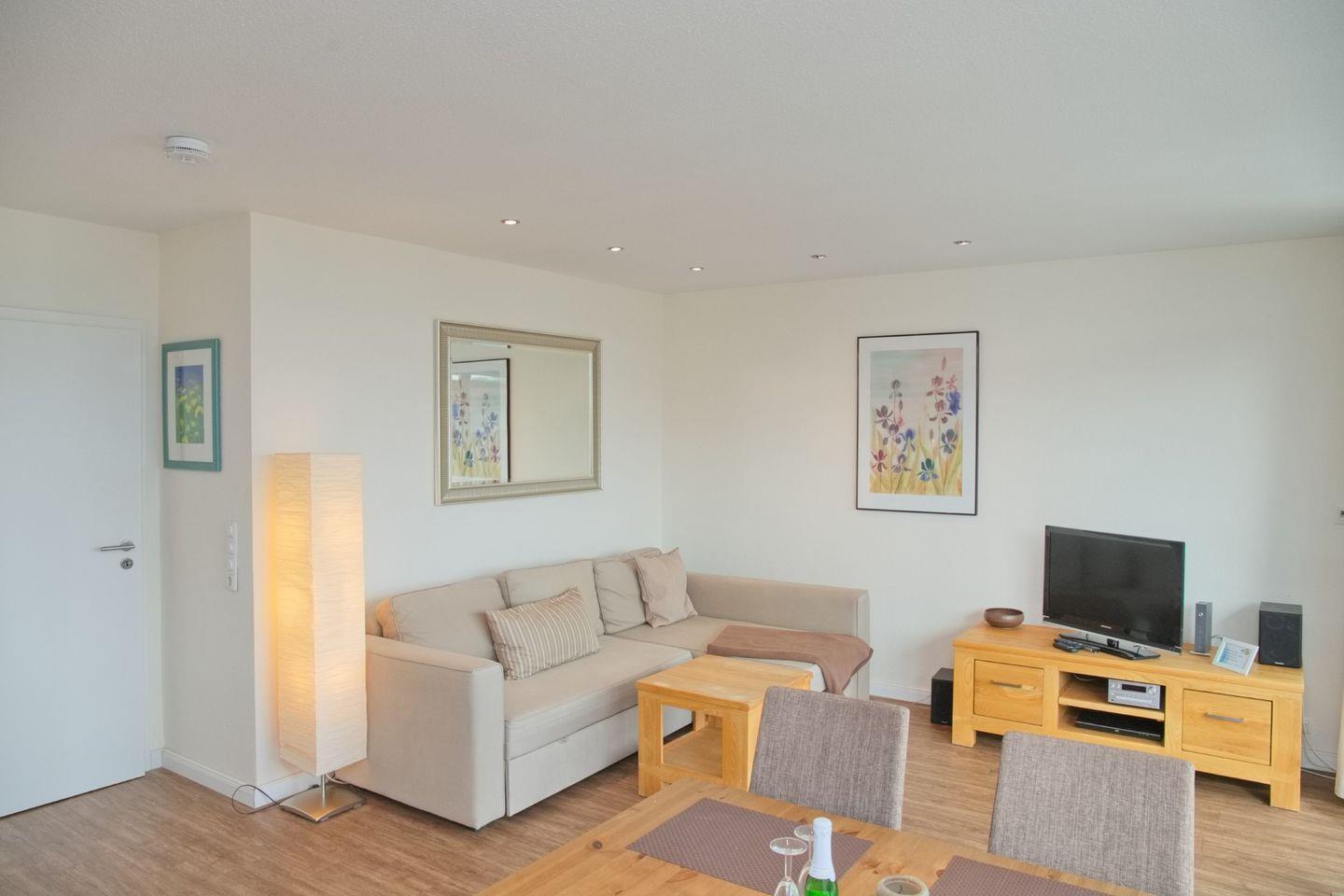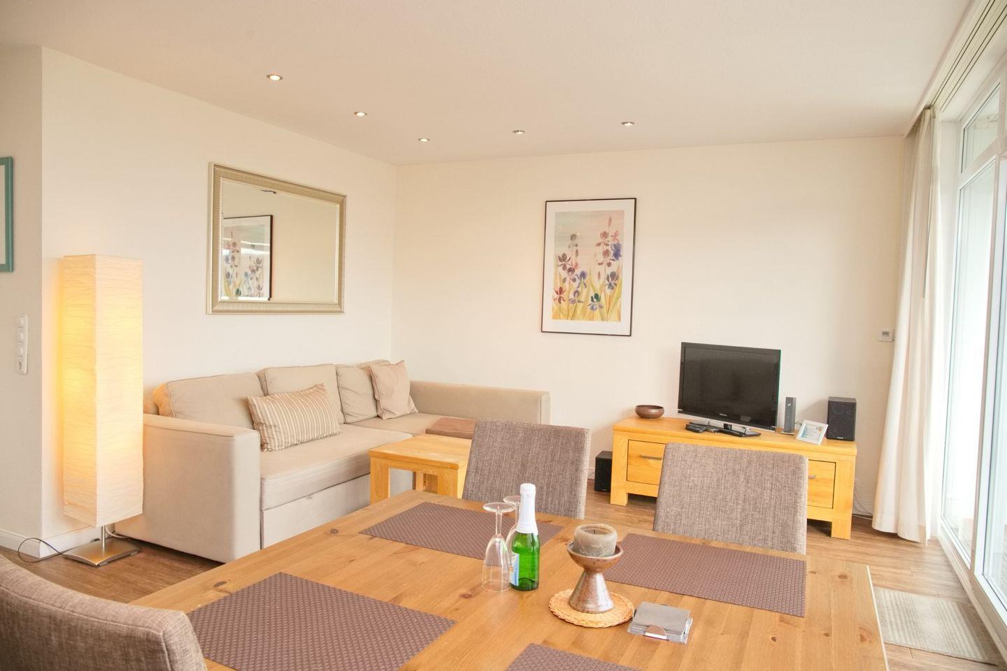 Die nur 2 Gehminuten vom Strand entfernte, im 2 Obergeschoss liegende Ferienwohnung mit möblierten Balkon ist modern und geschmackvoll eingerichtet. Die offene Einbauküche ausgestattet mit einem Cerankochfeld, Backofen, einem Kühlschrank, einem Geschirrspüler, Kaffeemaschine, Wasserkocher sowie einem Toaster geht in das stilvolle Wohnzimmer mit der ausziehbaren Eckcouch, einem Flach-TV, einem Radio/CD, einem BlueRay-Player und dem Essplatz für 4 Personen über. Das gemütliche Schlafzimmer bietet Ihnen ein Doppelbett sowie einen Kleiderschrank zum Verstauen Ihrer Anziehsachen. Da das Schlafzimmer nicht allzu groß ist, passt kein Kinderbett hinnein.