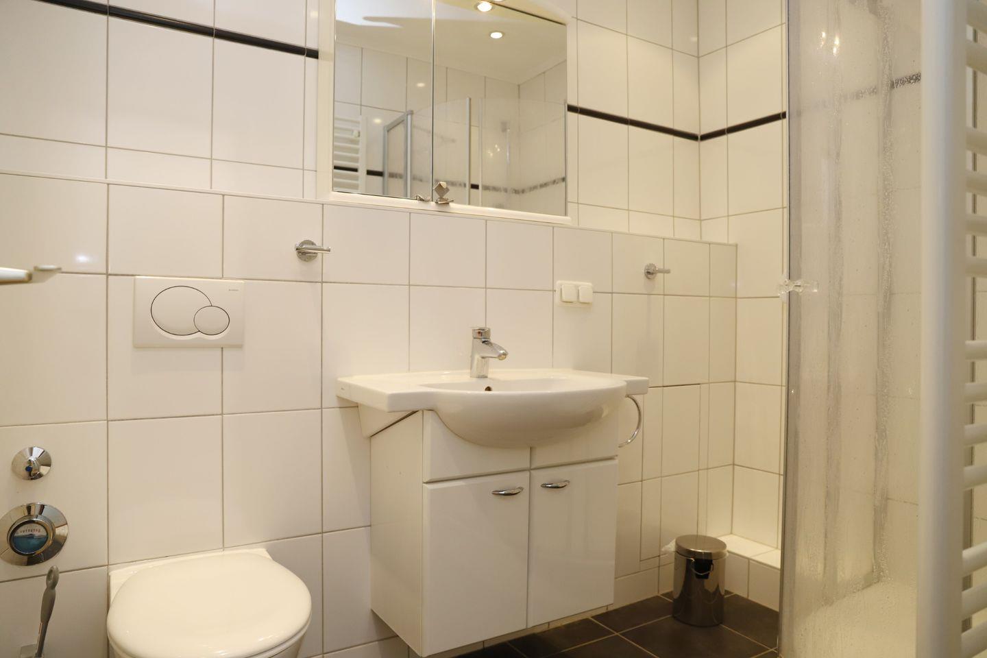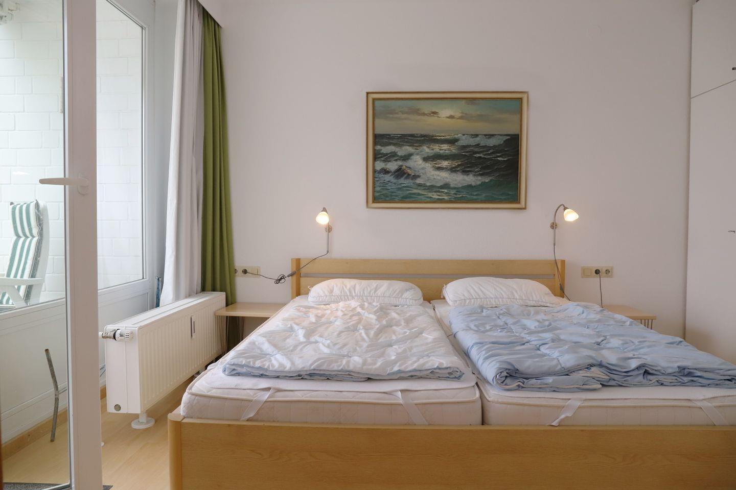 Auf gleicher Ebene zum Wohnbereich bietet Ihnen die Wohnung ein Schlafzimmer mit einem Doppelbett, 2 x 90 x 200 cm sowie einen weiteren Flach TV und ein Badezimmer mit Dusche und WC.