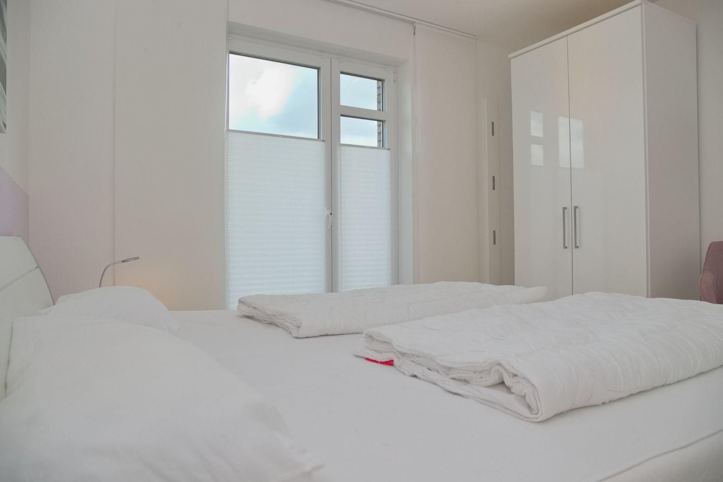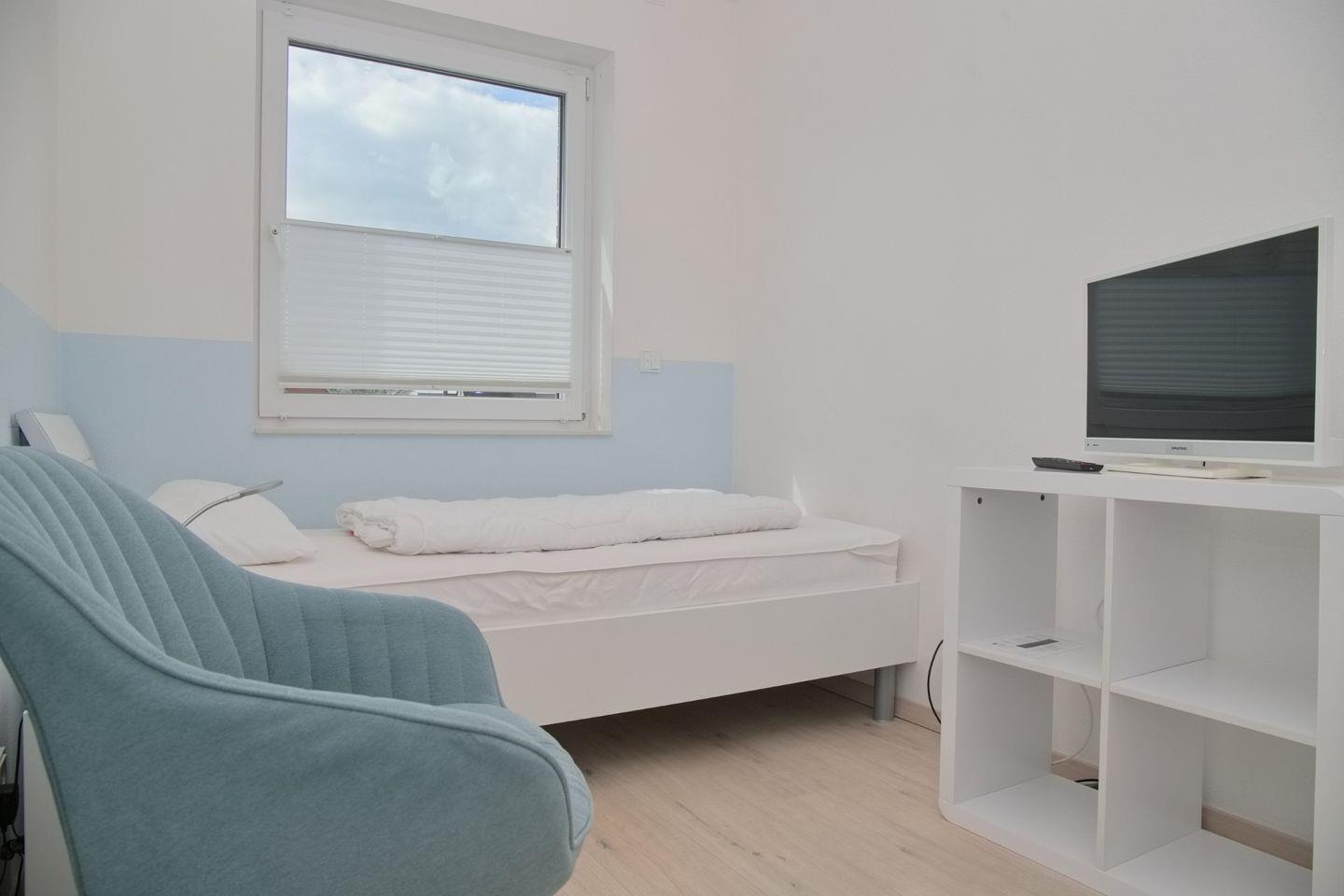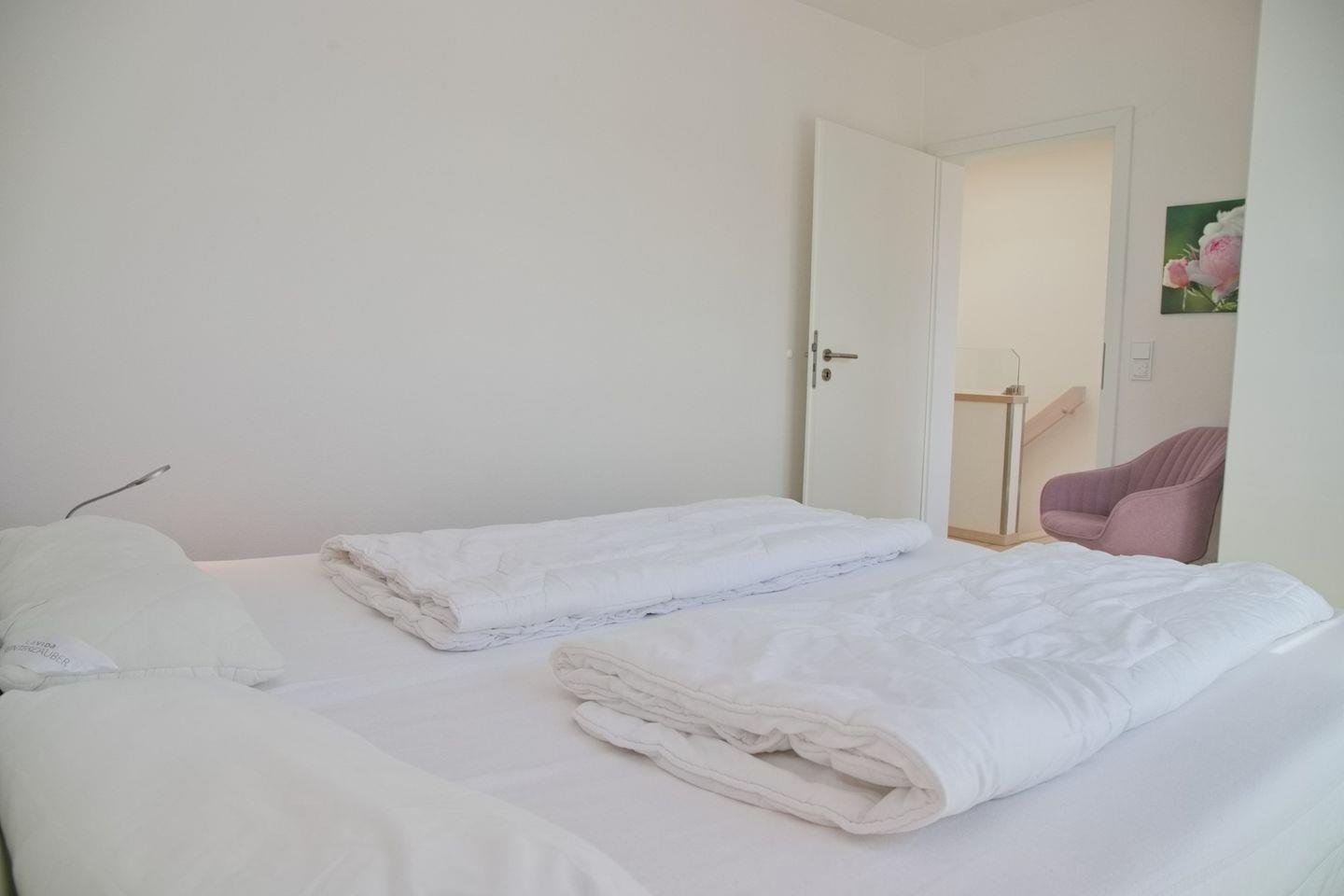 Im Obergeschoss befinden sich zwei weitere Schlafzimmer. Eines ist mit einem Doppelbett und einem Kleiderschrank ausgestattet und hat direkten Zugang zum Balkon. Das andere Zimmer bietet ein 1,40x2,00 m großes Einzelbett, einen Flachbild-TV und einen Kleiderschrank. In beiden Zimmern steht ein kleiner Sessel.