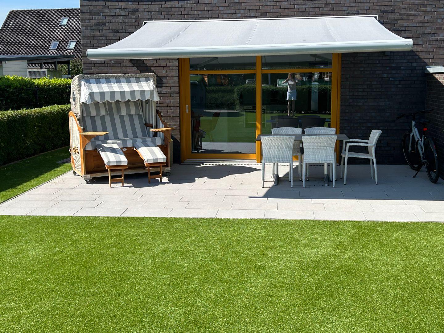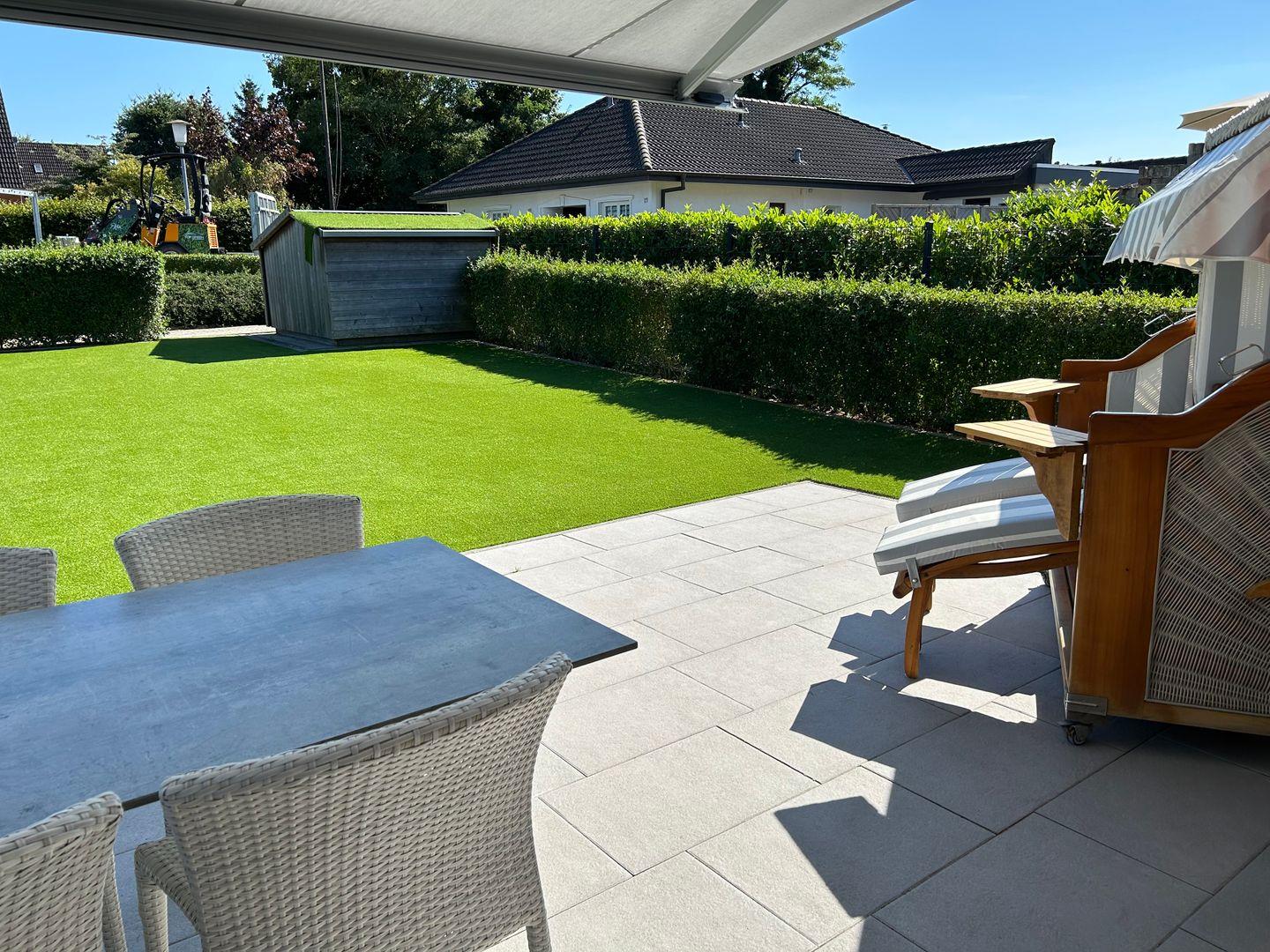 24qm Südterrasse mit elektrischer Markise, Sitzgarnitur und Strandkorb.