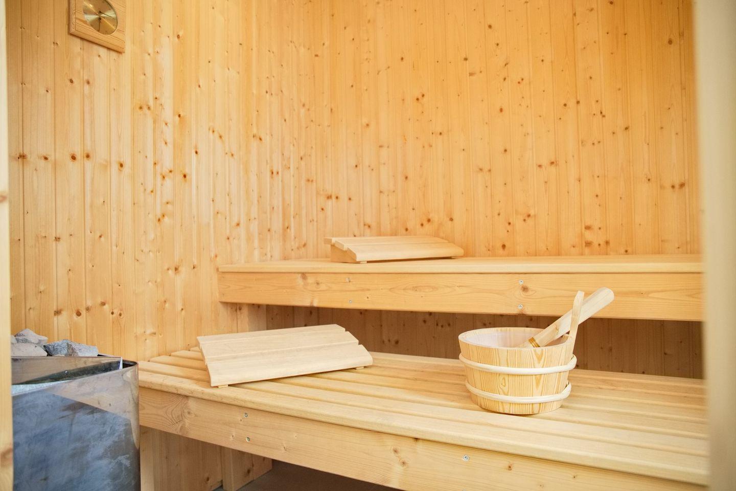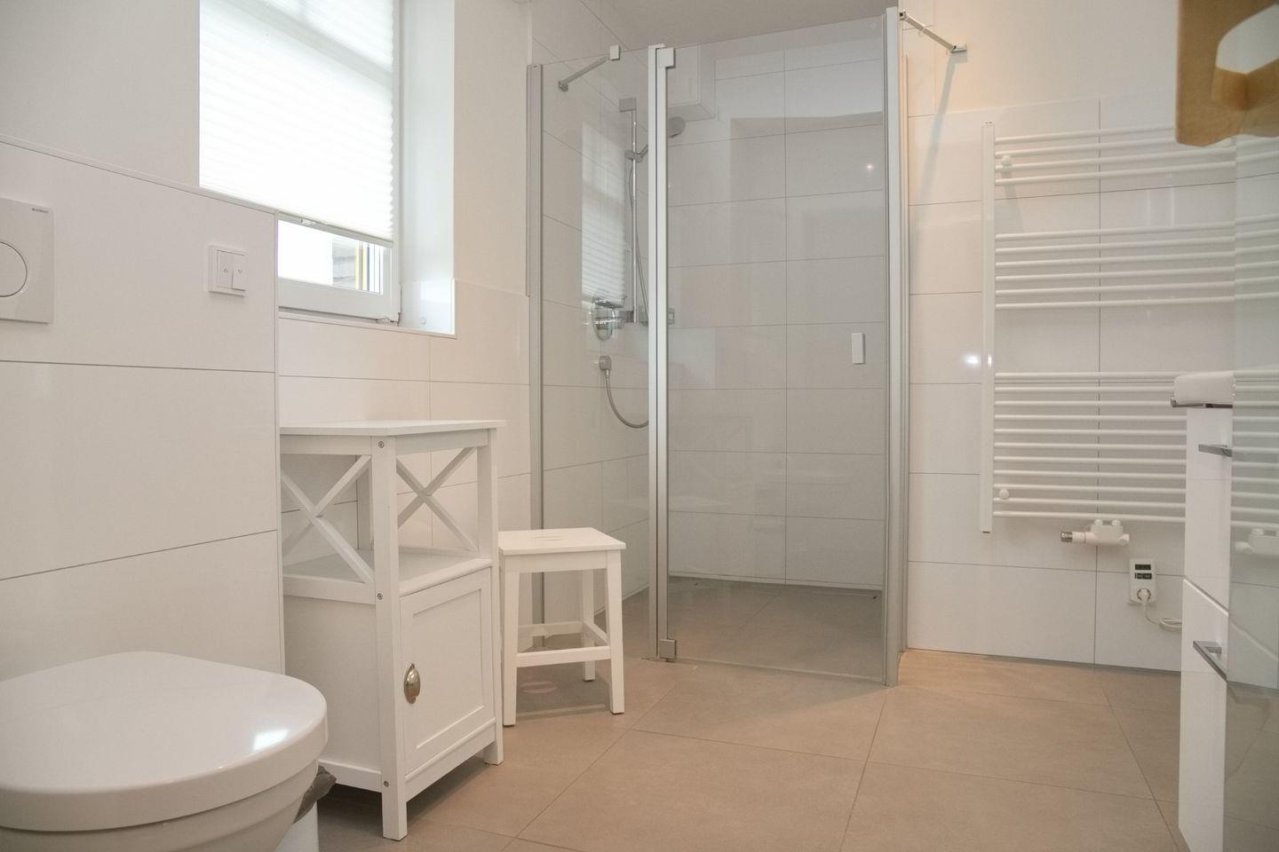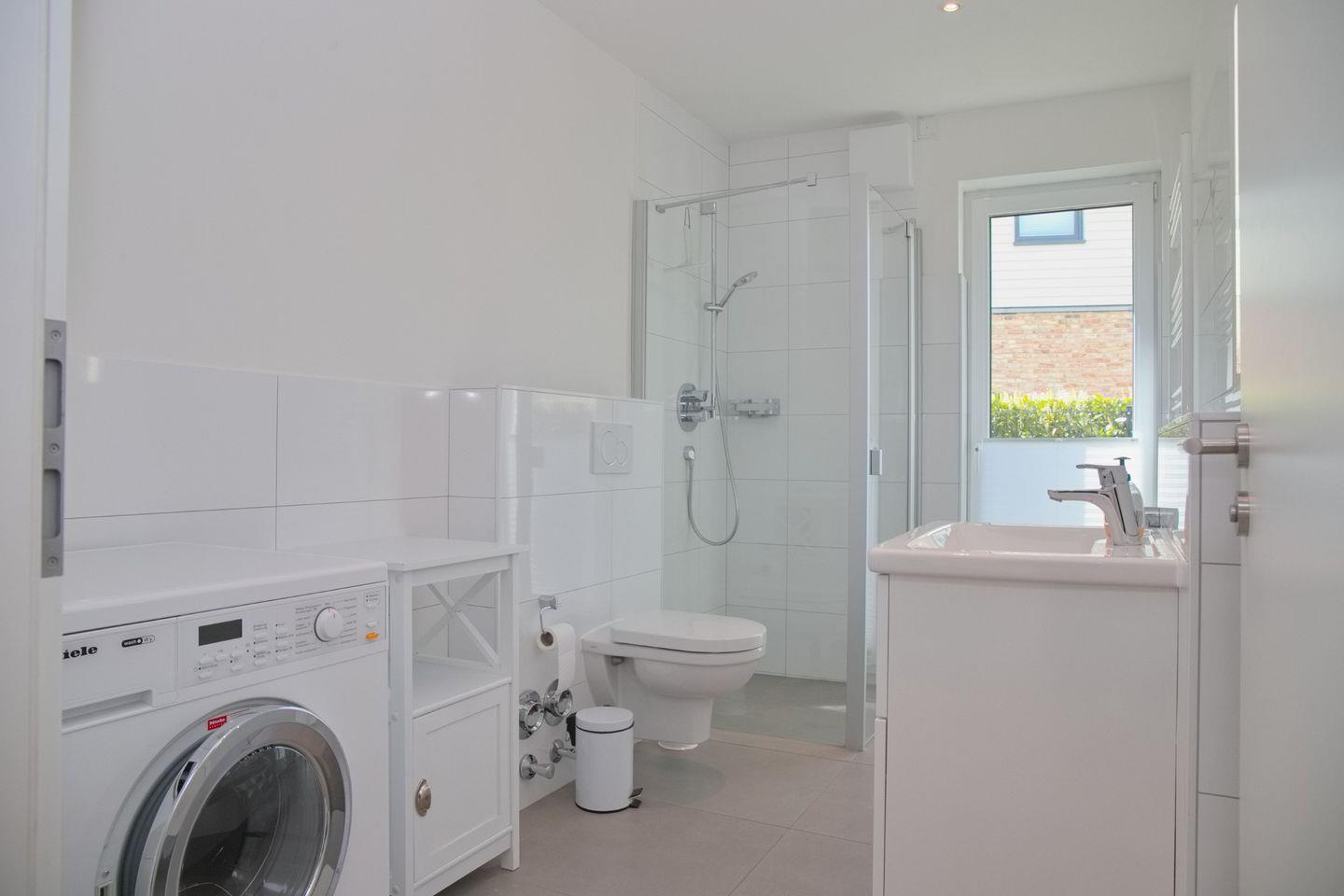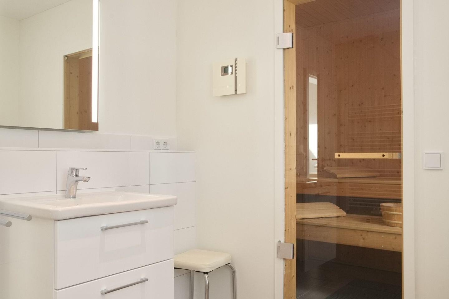 Das großzügige Bad im Obergeschoss ist ebenfalls modern gestaltet und verfügt über eine große bodengleiche Dusche, ein Waschbecken, ein WC sowie eine Sauna – ideal, um nach einem langen Strandtag zu entspannen.