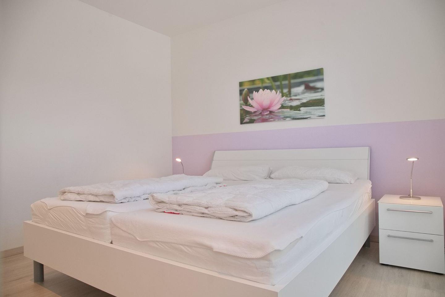 Außerdem befindet sich im Erdgeschoss ein Schlafzimmer mit einem komfortablen Doppelbett, einem Kleiderschrank und einem kleinen Sessel. Das moderne Bad ist durch ein bodentiefes Fenster lichtdurchflutet. Es verfügt über eine bodengleiche Dusche, ein WC, ein Waschbecken und einen praktischen Waschtrockner. Wäscheständer vorhanden.