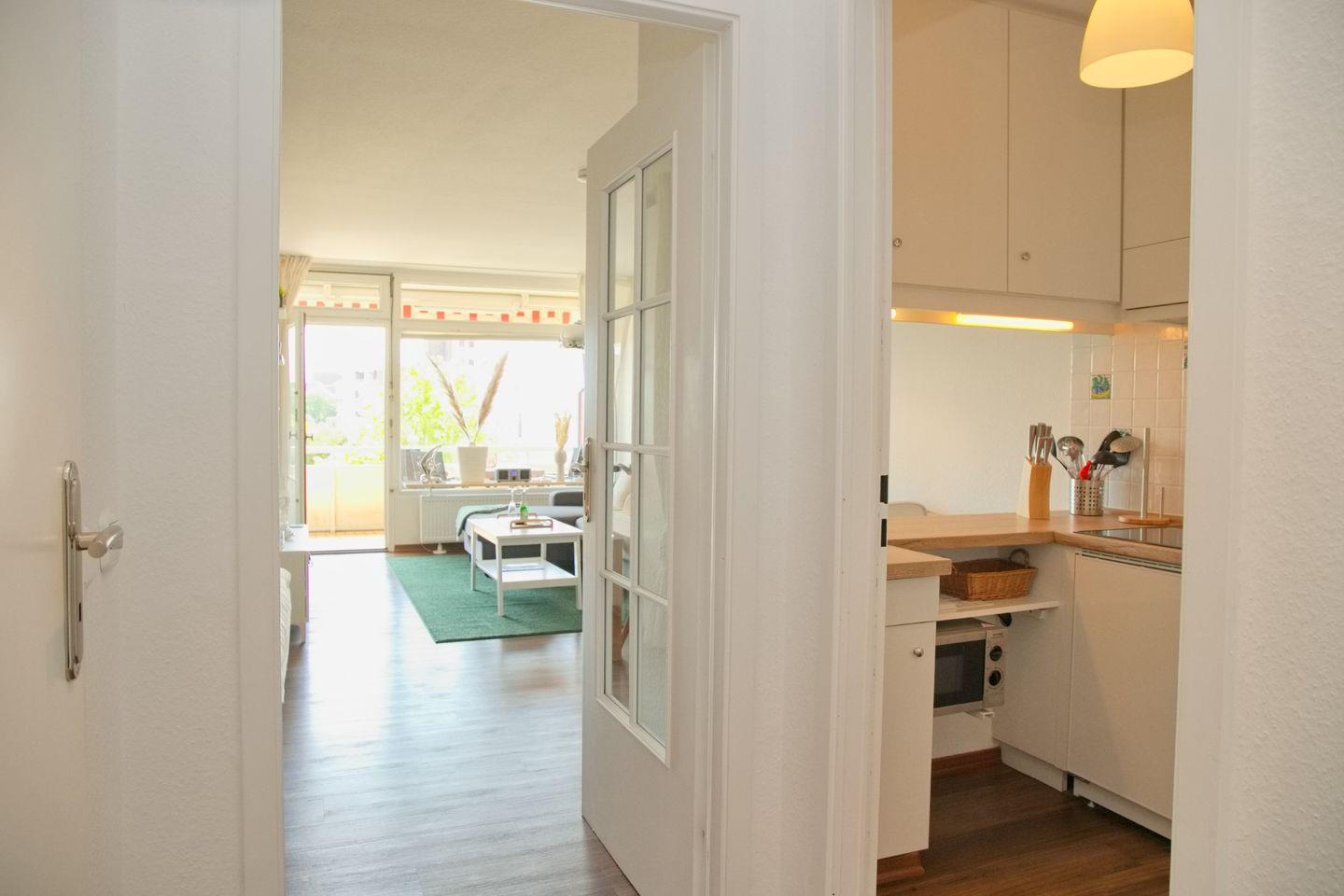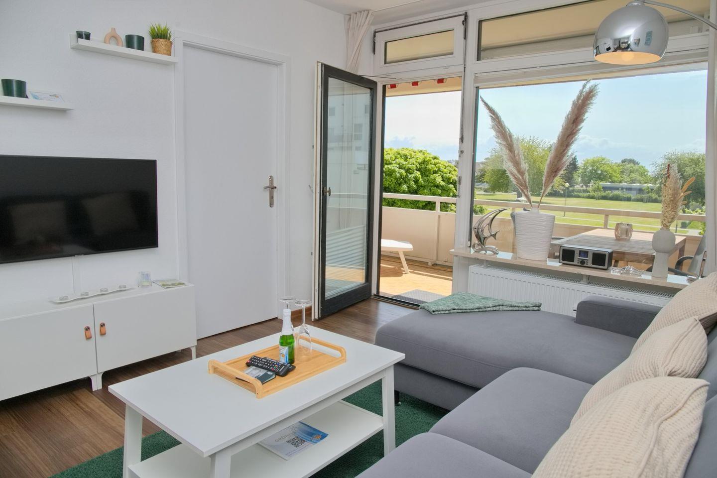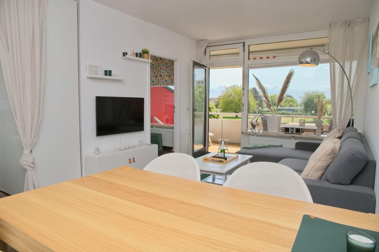 Helle und freundliche Ferienwohnung mit möblierten Süd-/ Westbalkon und Seeblick Richtung Yachthafen, in direkter Lage zur Promenade und dem Strand.
