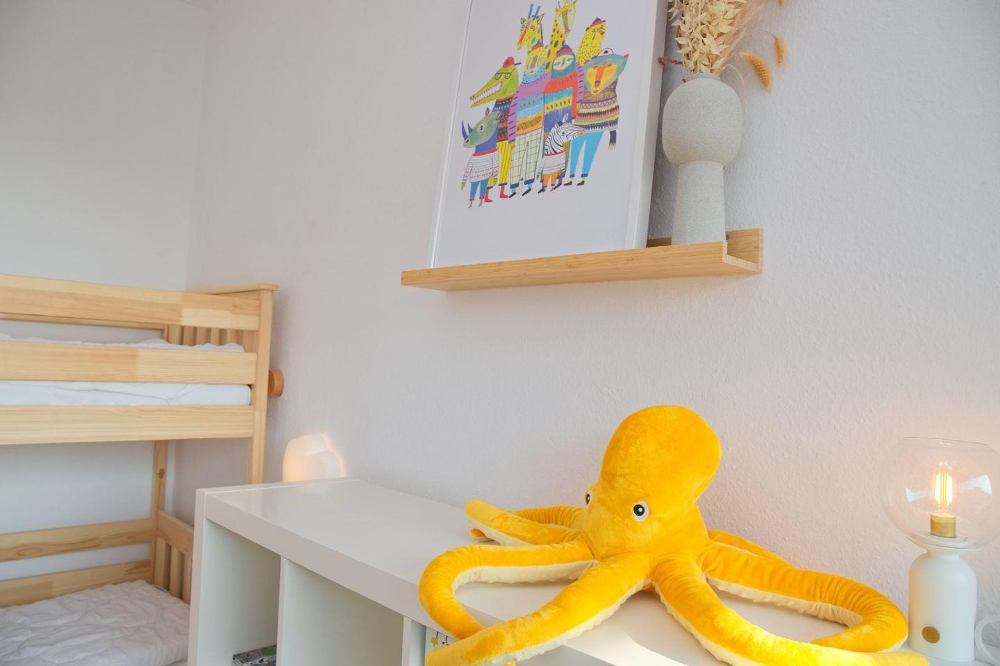 Für die kleinen Gäste gibt es ein Kinderzimmer mit einem Etagenbett (80x180 cm), einem Regal und einem gemütlichen Ohrensessel. Ein Fenster sorgt für ausreichend Licht und eine freundliche Atmosphäre.