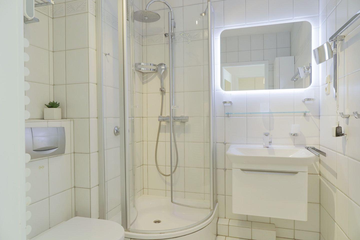 Das Badezimmer ist mit einer Dusche, einem WC, einem Waschtisch, einem Kosmetikspiegel, einem beleuchteten Spiegel und einem Handtuchheizkörper ausgestattet, damit Sie sich nach einem Tag am Strand frisch machen können.