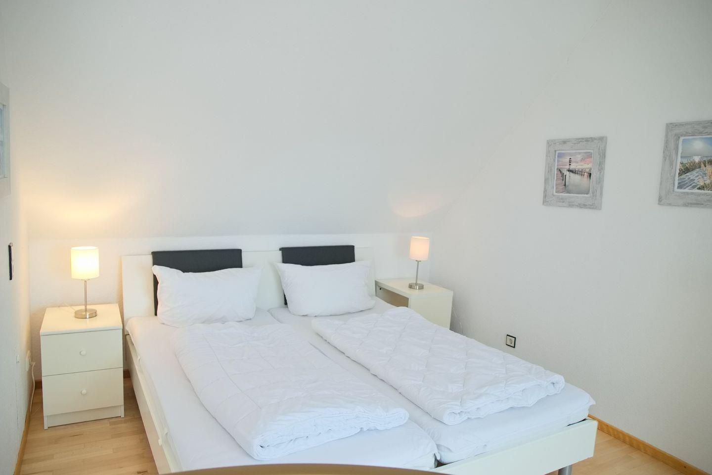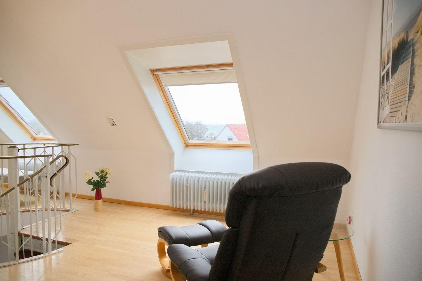Die Wohnung verfügt auf der 1. Wohnebene über ein Kinderzimmer mit Einzelbetten, Flach TV, Babybett und Kinderhochstuhl. Ein modernisiertes Duschbad mit Waschtisch, WC und Föhn. Der Wohnbereich überzeugt mit der Couchgarnitur, Flach TV, Stereoanlage, DVD-Player, offenem Essbereich und dem offenen Zugang zur Küche, sowie zum Balkon. Die Küche ist ausgestattet mit einem Geschirrspüler, Kühlschrank mit 3* Gefrierfach, Backofen, Cerankochfeld, Mikrowelle, Kaffeemaschine, Toaster, Wasserkocher. Auf der 2. Wohnebene, die über eine Wendeltreppe zu erreichen ist, befindet sich das Schlafzimmer mit Doppelbett und Kleiderschrank. Die Fenster lassen sich durch Verdunklungsrollos abdunkeln. Auf dieser ebene finden Sie auch das Gäste- WC, sowie eine gemütliche Ecke mit Korbsesseln und Teilseeblick. Eine Münzwaschmaschine steht zur allgemeinen Nutzung zur Verfügung. In dieser Nichtraucherwohnung ist ein Hund erlaubt.