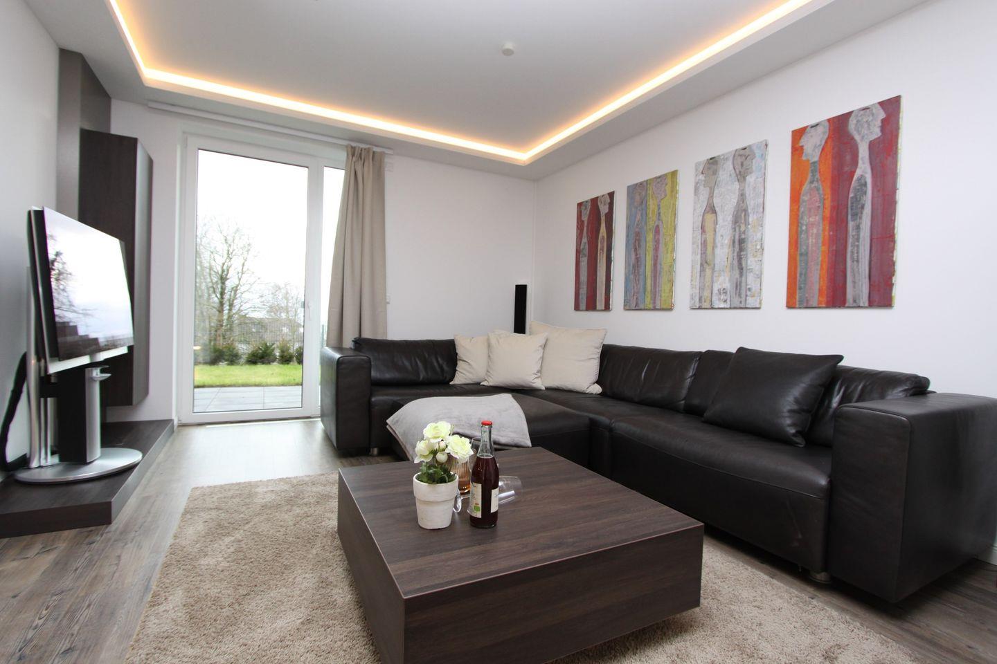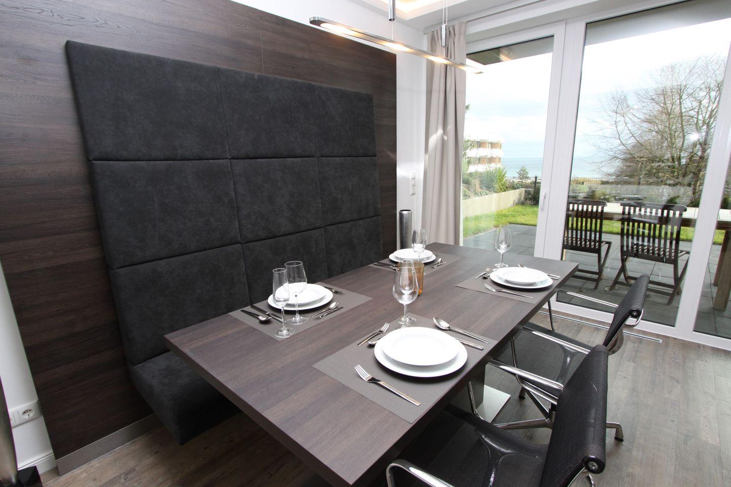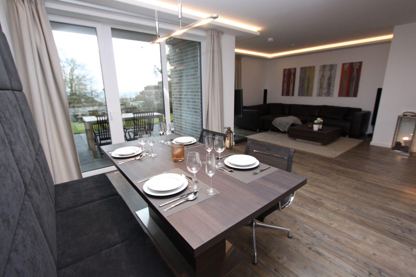 Exklusive und hochwertige Ferienwohnung mit zwei Terrassen und Garten, oberhalb vom Yachthafen mit Seeblick, nur ein Steinwurf zur Strandpromenade.