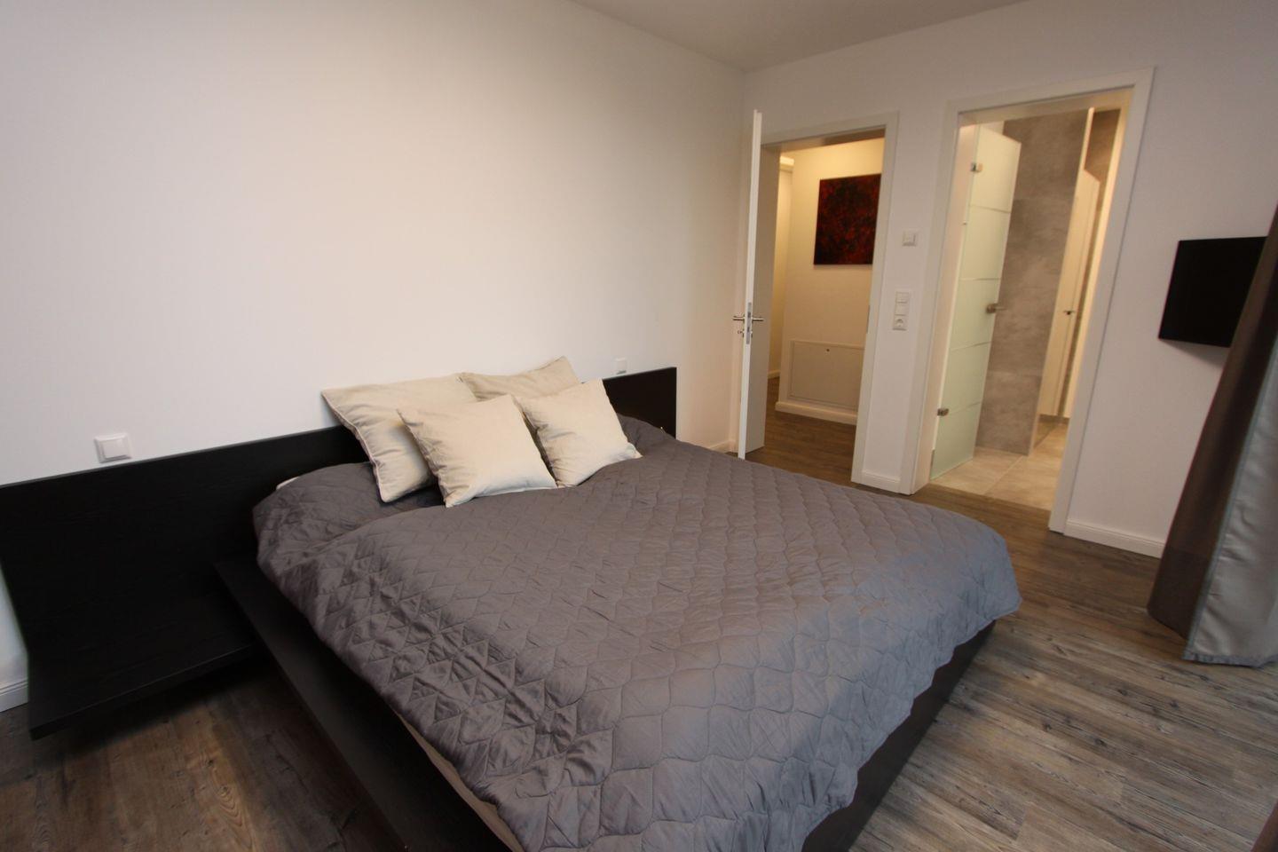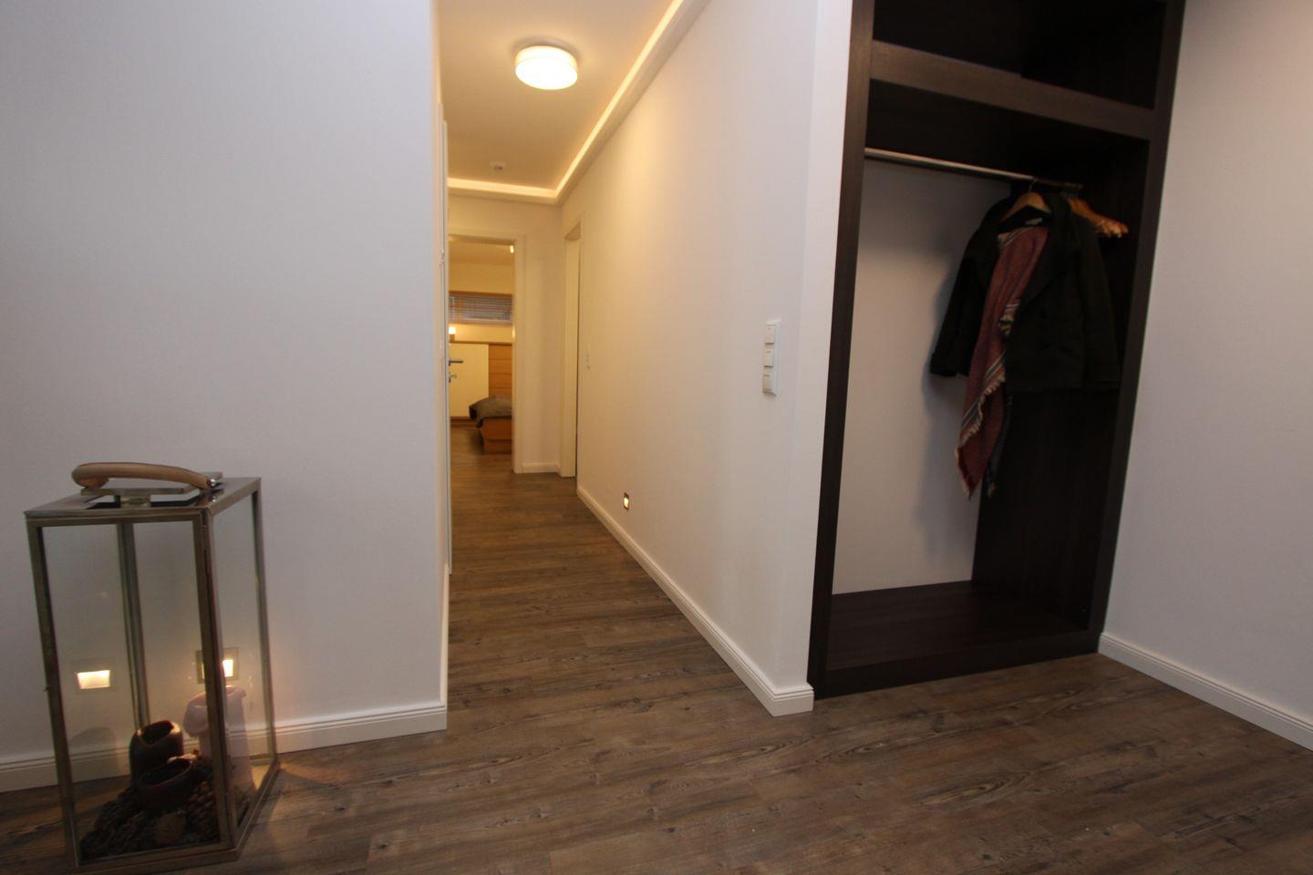 In den Schlafräumen sind Verdunklungsgardinen vorhanden. Die gesamte Wohnung ist mit Designer Planke ausgestattet und verfügt über Einbauschränke, sowie indirekte Beleuchtung.