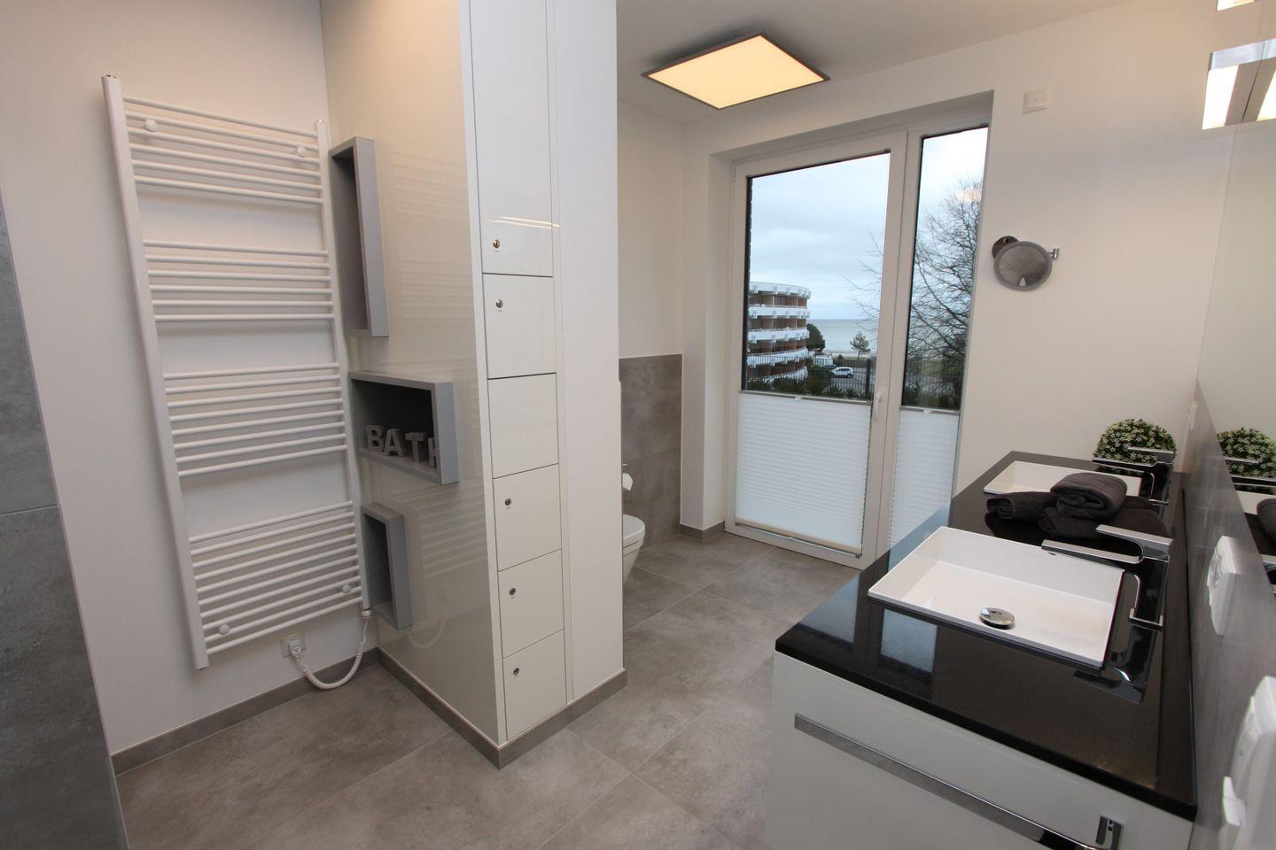 Der großzügige Wohn-, Ess- und Küchenbereich gehen harmonisch ineinander über. Die Einrichtung wird Sie begeistern - Hier ist Wohlfühlen inklusive. Der Wohnbereich bietet Ihnen neben einer großen Couchgarnitur einen Flach TV und eine B&O Anlage. Die offen gestaltete Küche ist voll ausgestattet, hier finden Sie einen weiteren Flach TV. Schon beim Kochen können Sie den Blick über die Ostsee schweifen lassen. Des Weiteren verfügt die geschmackvoll eingerichtete Wohnung über 2 Schlafzimmer, mit je einem Doppelbett, Kleiderschrank und Flach TV. Eines der Duschbäder ist an dem großen Schlafzimmer angrenzend, das zweite ist vom Flur aus zu begehen. In den Bädern erwarten Sie je eine bodengleiche Dusche, ein Waschtisch, Spiegel und WC. Genießen Sie vom Duschbad en Suite schon morgens den herrlichen Blick auf die See. Ein Waschtrockner steht während des Aufenthalte in dem Abstellraum in der Wohnung zur Verfügung.