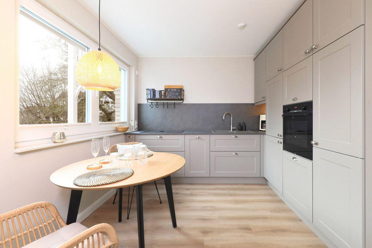 Über einen komfortablen Fahrstuhl kann die Wohnung im 2. Obergeschoss bequem erreicht werden. Im Inneren verzaubert sofort die nordische Gemütlichkeit. Durch die großen, teilweise bodentiefen Fenster wird der Wohnraum lichtdurchflutet. Eine große, gemütliche Couch wird im Handumdrehen zu einem weiteren Schlafplatz und ein sehr schöner Essbereich laden zum ausgiebigen Entspannen ein. Die Küche ist offen gestaltet und bietet neben einem Backofen, Induktionskochfeld und einer Geschirrspülmaschine sämtlichen Komfort.