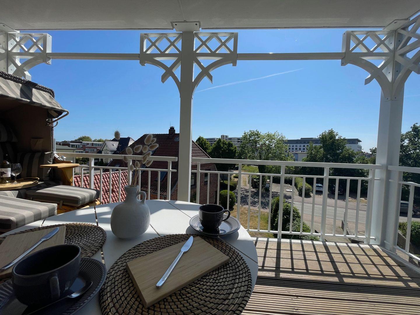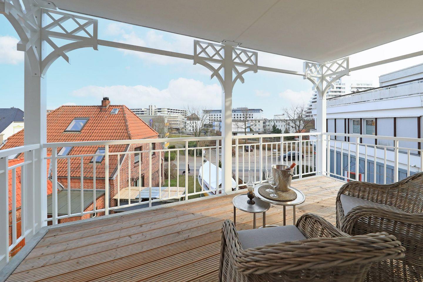Großer Süd- /Westbalkon mit ca. 16m², überdacht mit Gartenmöbeln und Strandkorb (ca. von April bis Oktober).